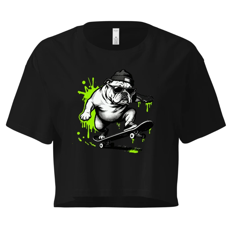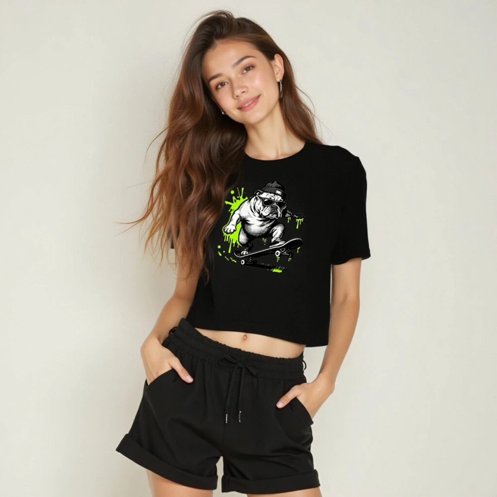 Cool women’s crop top featuring a bold, black-and-white bulldog skateboarding in sunglasses and beanie, accented with vibrant neon green splatter. Designed for streetwear lovers—fit is relaxed, fabric is soft cotton blend. Perfect for casual outings or skate culture fans. Style code: BT-CT-W-01.