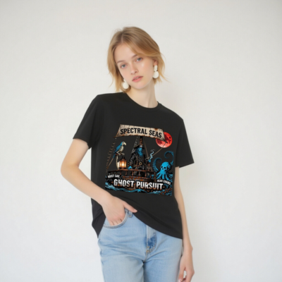 A hauntingly cool unisex organic cotton t-shirt featuring a spectral pirate captain, skeleton parrot, and skull-headed octopus under a blood moon. ‘Spectral Seas’ and ‘Ghost Pursuit’ design with nautical phrases ‘Hoist Sail’ and ‘Hear Chains’. Eco-friendly, soft, and bold—perfect for ghostly voyages. Made from certified organic cotton (no additional certifications claimed beyond material origin).