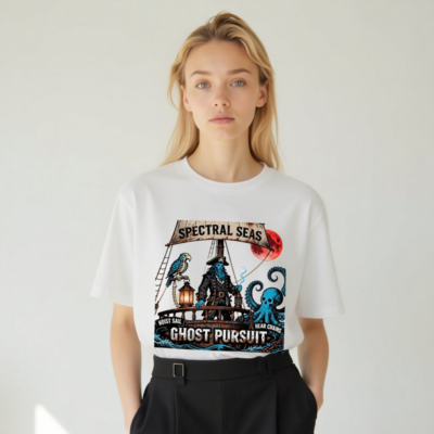 A bold, unisex organic cotton t-shirt featuring the ‘Spectral Seas’ design: a blue-skinned pirate captain, skeletal parrot, glowing lantern, and skull-headed octopus against a red moon. ‘Ghost Pursuit’ and ‘Hoist Sail, Hear Chains’ complete the nautical horror theme. Crafted from certified organic cotton for comfort and sustainability. Ideal for fans of dark fantasy, pirate lore, and supernatural adventure.