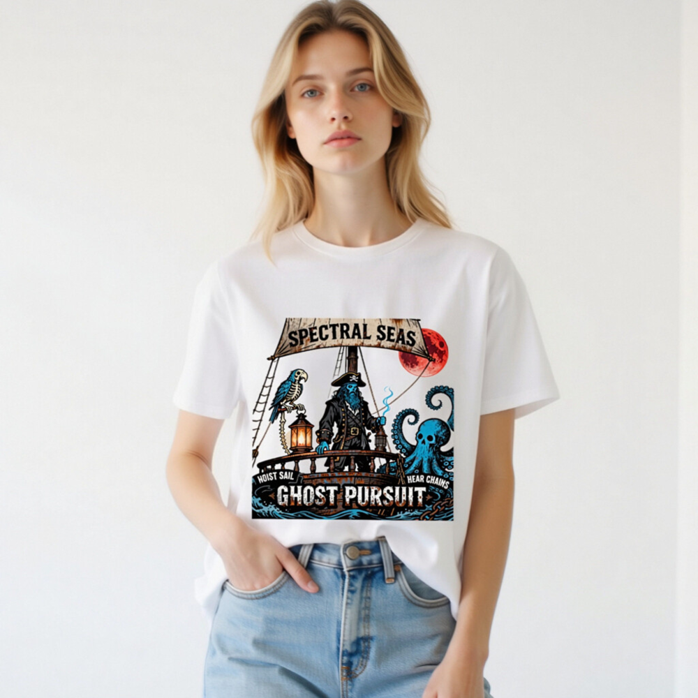 A bold, unisex organic cotton t-shirt featuring the ‘Spectral Seas’ design: a blue-skinned pirate captain, skeletal parrot, glowing lantern, and skull-headed octopus against a red moon. ‘Ghost Pursuit’ and ‘Hoist Sail, Hear Chains’ complete the nautical horror theme. Crafted from certified organic cotton for comfort and sustainability. Ideal for fans of dark fantasy, pirate lore, and supernatural adventure.