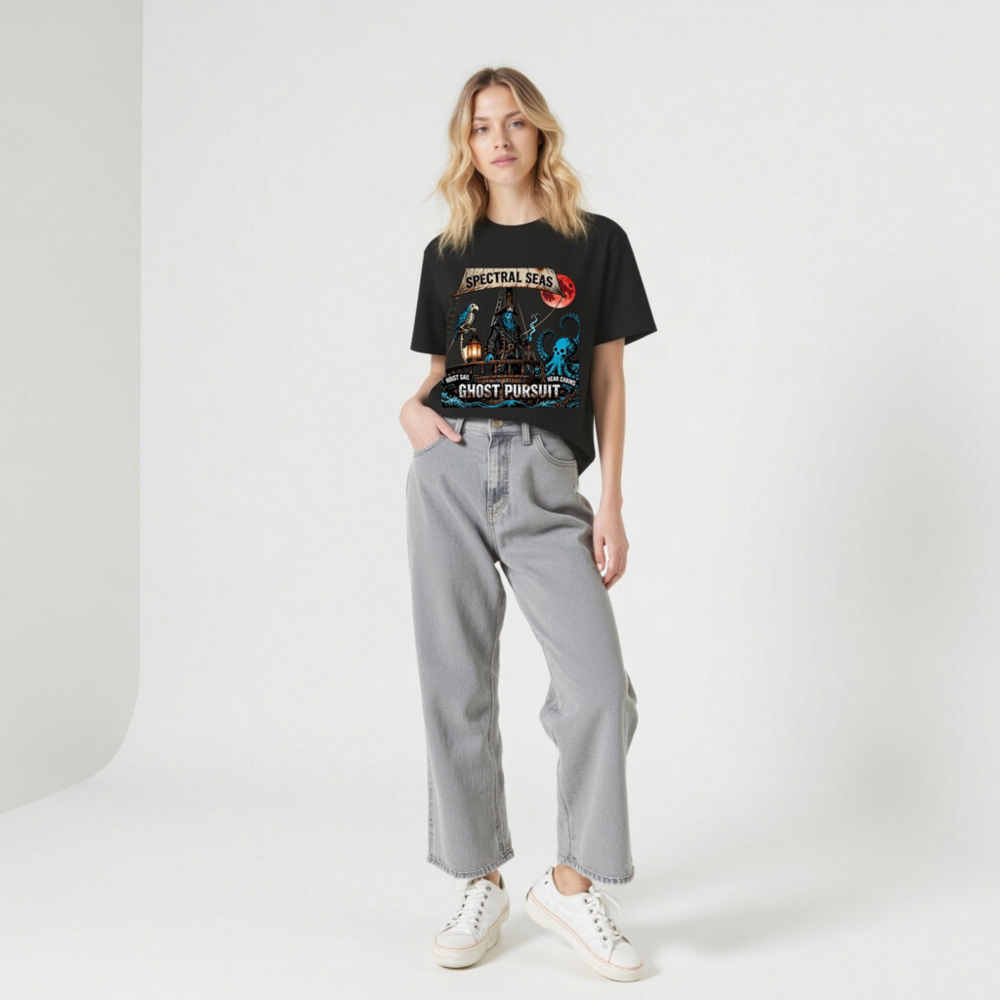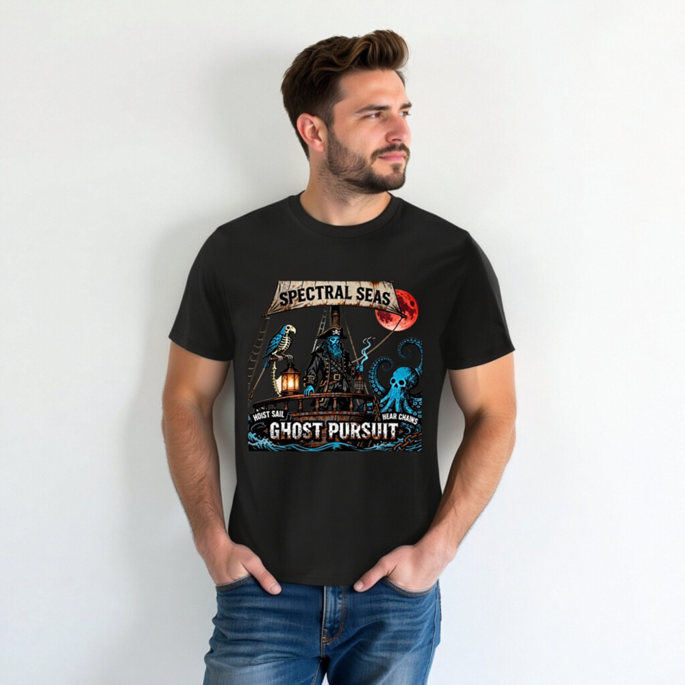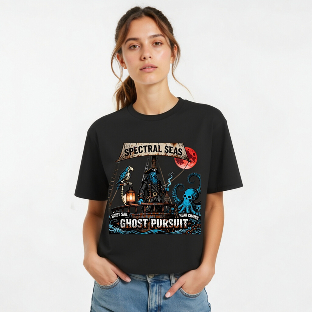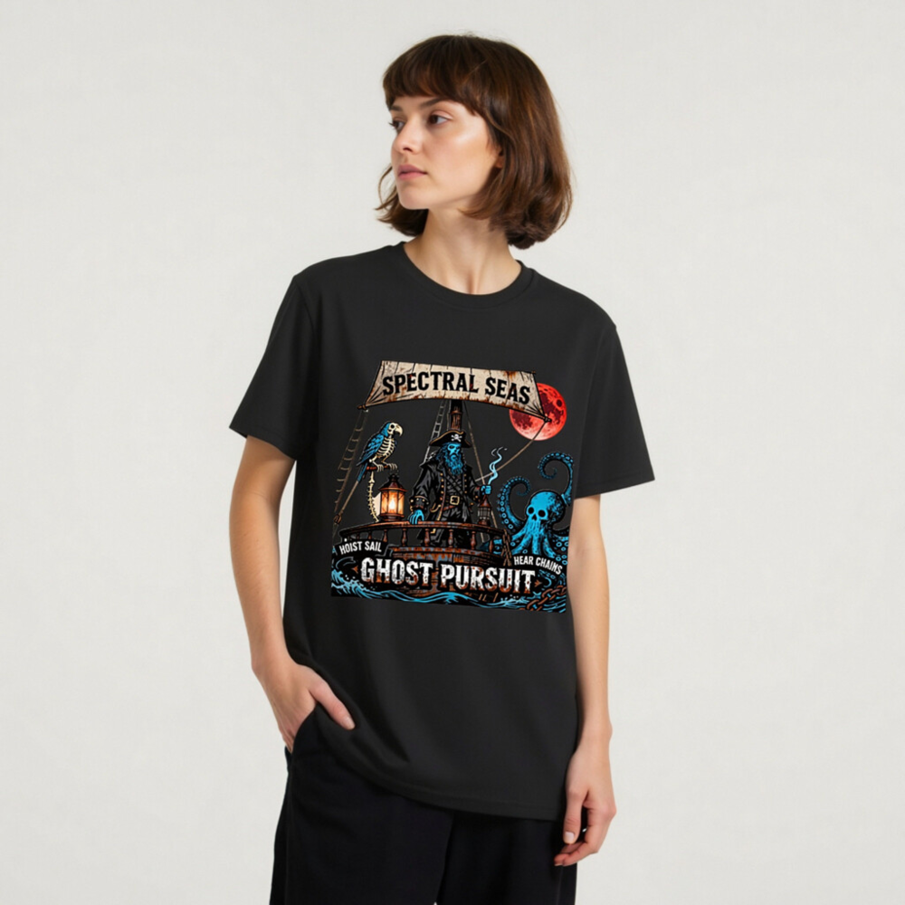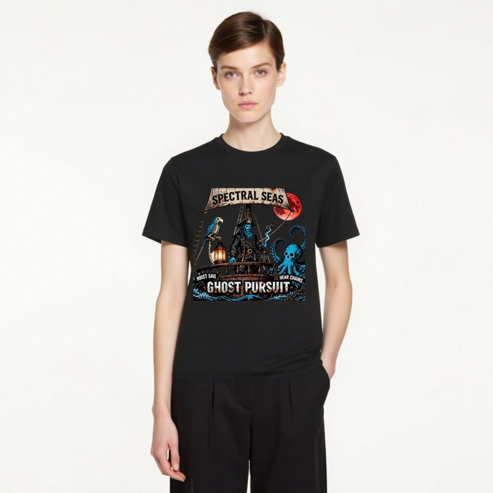 A hauntingly cool unisex organic cotton t-shirt featuring a spectral pirate captain, skeleton parrot, and skull-headed octopus under a blood moon. ‘Spectral Seas’ and ‘Ghost Pursuit’ design with nautical phrases ‘Hoist Sail’ and ‘Hear Chains’. Eco-friendly, soft, and bold—perfect for ghostly voyages. Made from certified organic cotton (no additional certifications claimed beyond material origin).