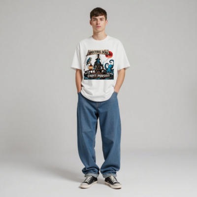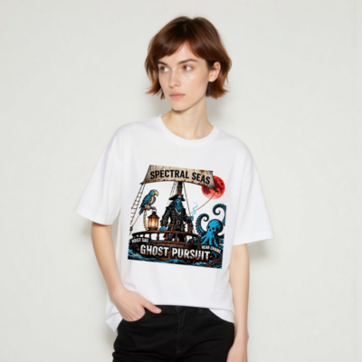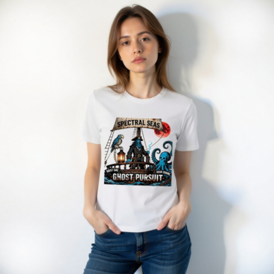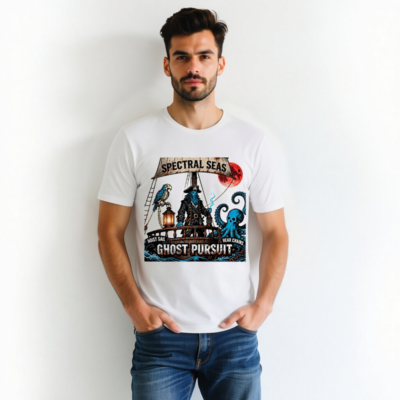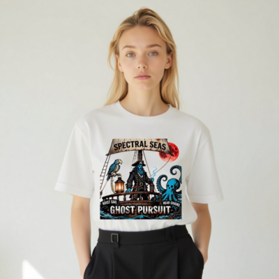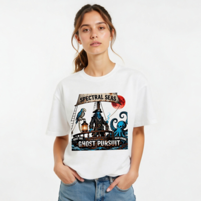 Wear the ‘Ghost Pursuit’ unisex staple t-shirt featuring a haunting nautical scene: a blue pirate captain, skeletal parrot, and skull-headed octopus beneath a red moon. Sail the Spectral Seas with this bold design—hoist sail, hear chains. Premium soft cotton blend, classic fit for men and women. Perfect for fans of maritime horror and fantasy aesthetics.