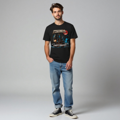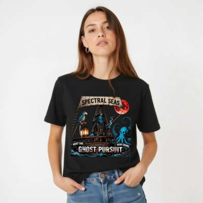 Unisex Staple T-Shirt featuring the ‘Spectral Seas’ design: a blue-skinned pirate, skeletal parrot, and skull-headed octopus on a ship under a blood moon. Bold ‘Ghost Pursuit’ graphic with ‘Hoist Sail, Hear Chains’ motif. Premium cotton blend, classic fit—ideal for Halloween, pirate fans, or supernatural enthusiasts. SEO-optimized for ‘ghost t-shirt’, ‘pirate shirt’, ‘spooky apparel’.