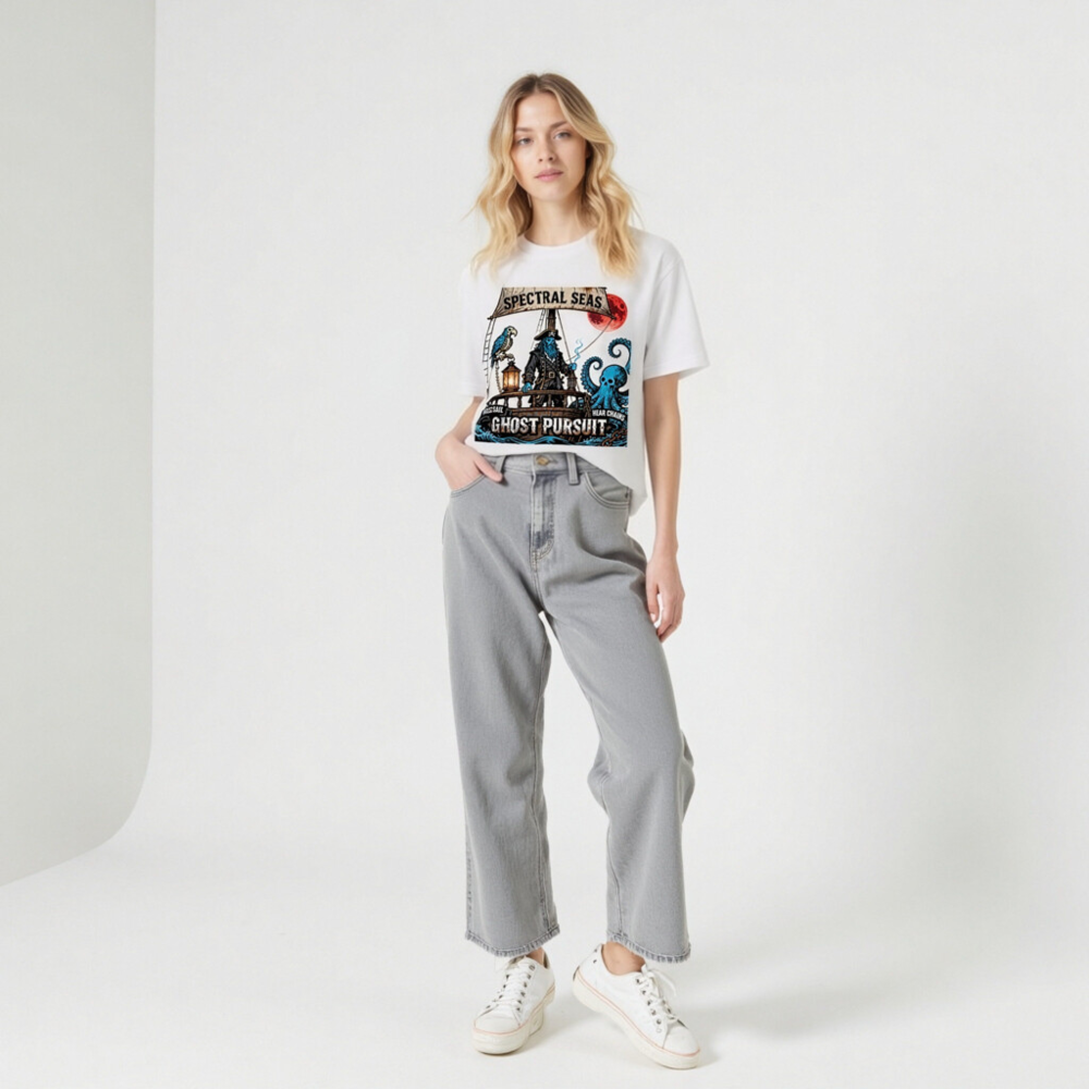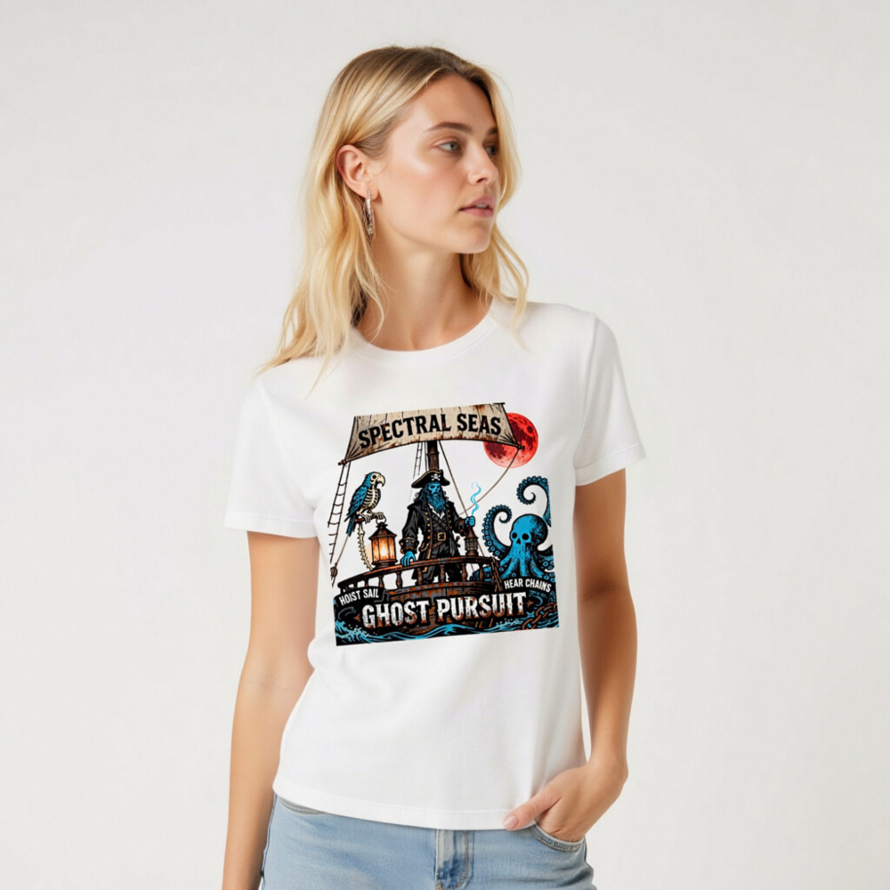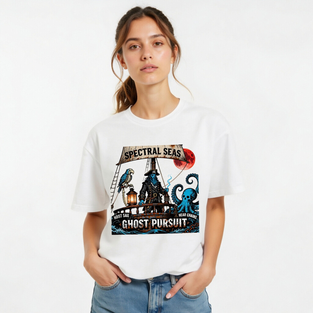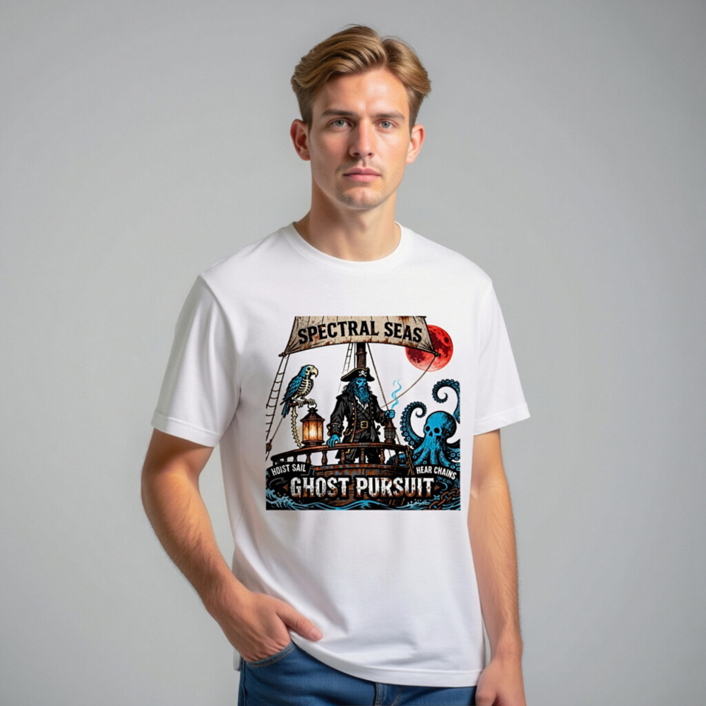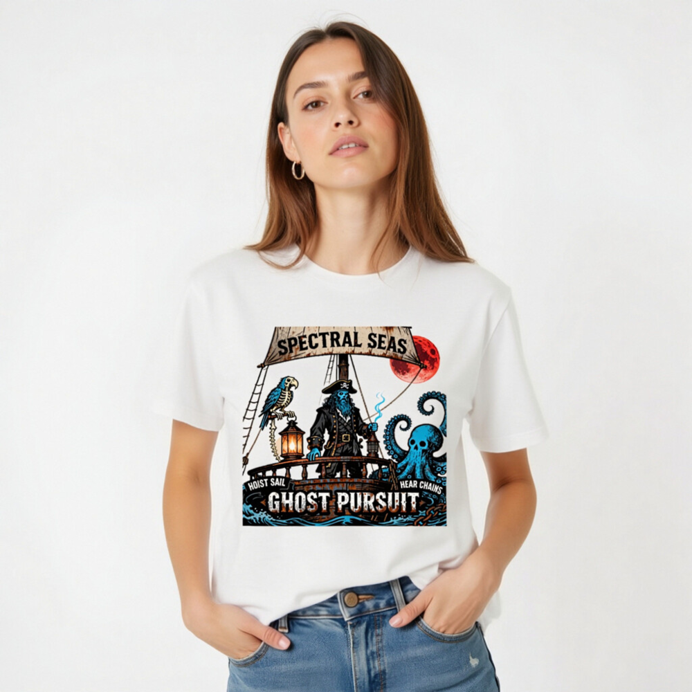 Spectral Seas Ghost Pursuit Unisex T-Shirt | Blue Pirate & Octopus Design