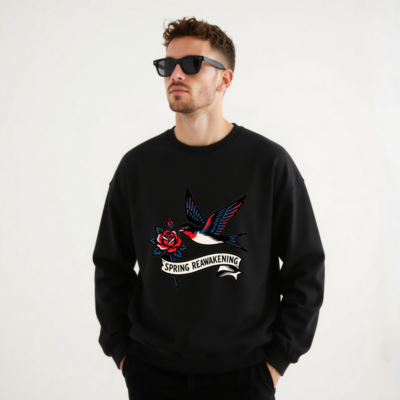 Bold vintage-style swallow in flight with red rose, paired with ‘SPRING REAWAKENING’ banner. This unisex crew neck sweatshirt features a striking retro tattoo-inspired design—vibrant red, black, and blue tones on soft, comfortable fabric. Perfect for spring awakening lovers seeking timeless, artistic streetwear. Designed for everyday wear, true to size, machine washable.