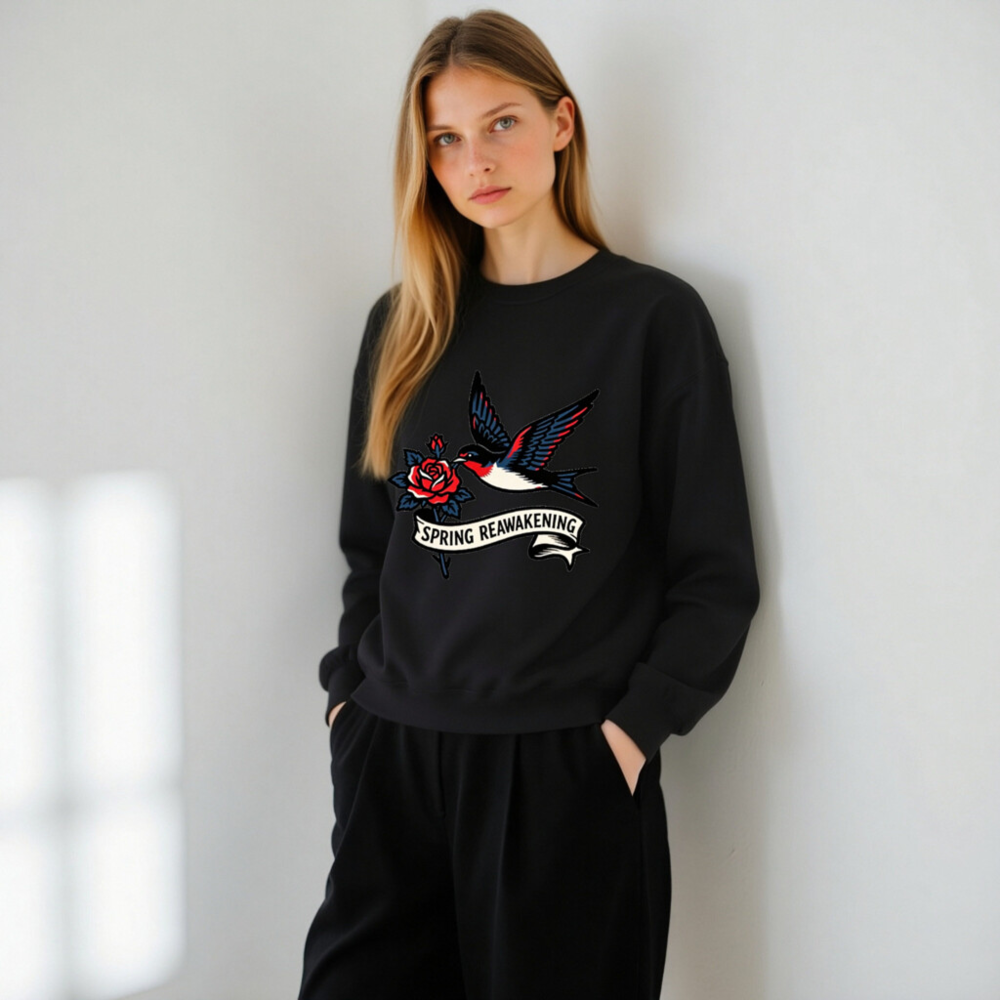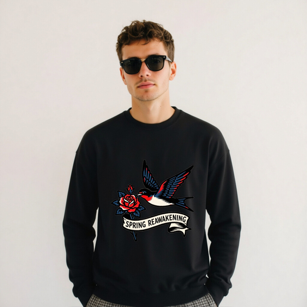 Bold vintage-style swallow in flight with red rose, paired with ‘SPRING REAWAKENING’ banner. This unisex crew neck sweatshirt features a striking retro tattoo-inspired design—vibrant red, black, and blue tones on soft, comfortable fabric. Perfect for spring awakening lovers seeking timeless, artistic streetwear. Designed for everyday wear, true to size, machine washable.