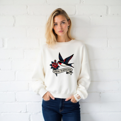 Wear the revival of spring with this unisex crew neck sweatshirt featuring a vintage-style tattoo design: a red-breasted swallow in flight beside a blooming red rose. The cream banner reads ‘SPRING REAWAKENING’—a symbolic nod to renewal and nature’s awakening. Soft, comfortable cotton blend, classic fit for all genders. Perfect for seasonal transitions and lovers of timeless folk art motifs.