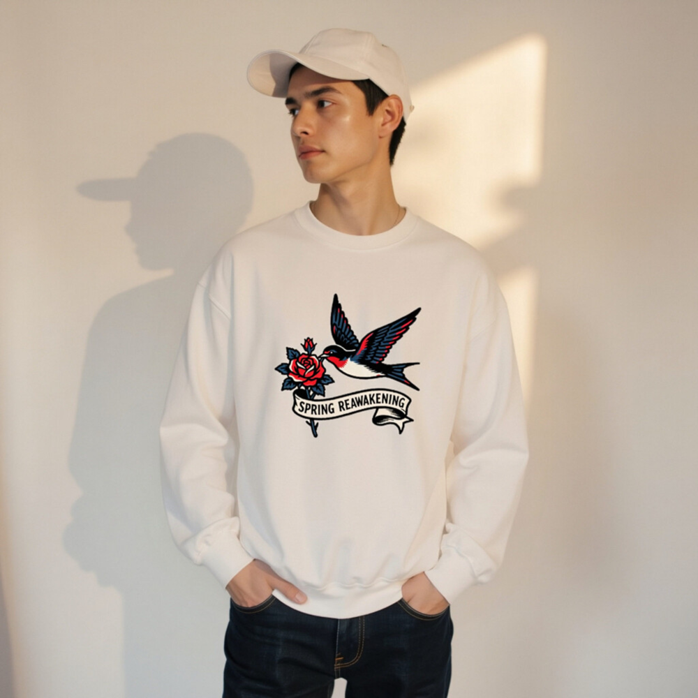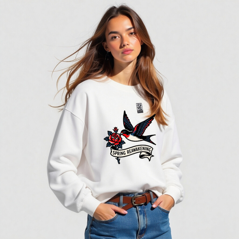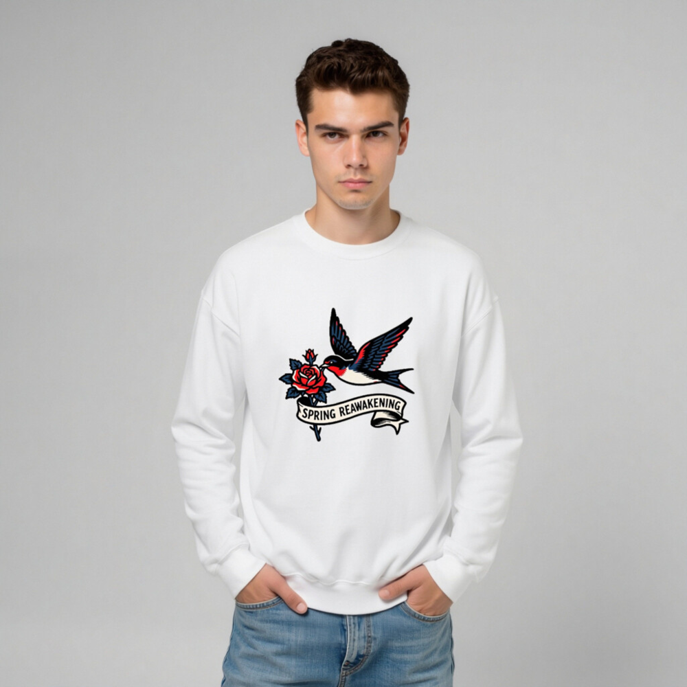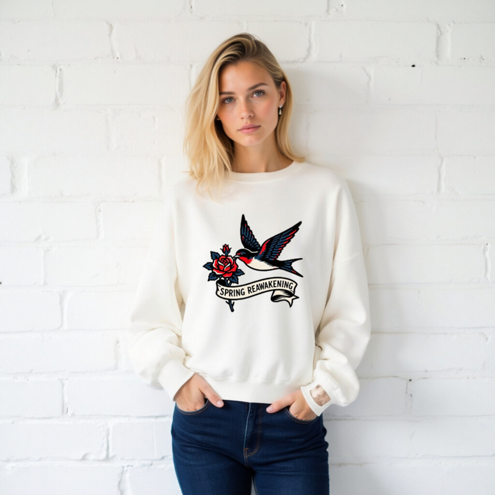 Spring Reawakening Sweatshirt – Unisex Crew Neck, Vintage Bird & Rose Tattoo Design