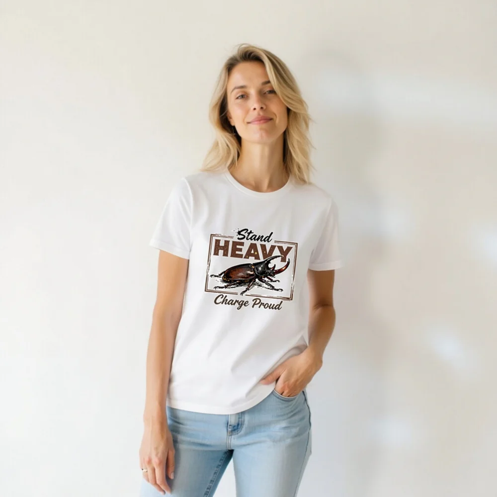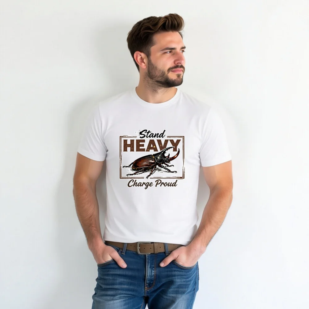 Bold and unapologetic, this unisex staple t-shirt features a striking rhinoceros beetle graphic with the empowering slogan ‘Stand Heavy, Charge Proud’. Printed on soft, premium cotton for all-day comfort. Perfect for insect lovers, nature enthusiasts, or anyone who embraces strength and individuality. Ideal for casual wear, outdoor adventures, or as a unique gift. Machine washable, durable print, and true-to-size fit ensure long-lasting style. A statement piece that combines entomology-inspired art with motivational messaging—wear your confidence proudly.