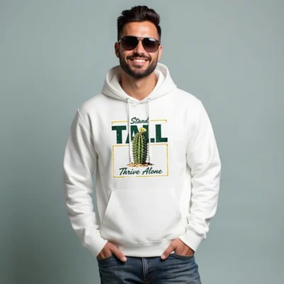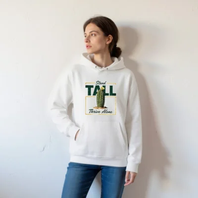 This unisex eco hoodie features a bold ‘Stand Tall, Thrive Alone’ cactus graphic—symbolizing resilience and independence. Made from sustainable, soft cotton blend fabric, it offers comfort and style for everyday wear. Perfect for nature lovers, minimalists, or anyone embracing self-reliance. The classic pullover design includes a front pocket, adjustable drawstring hood, and ribbed cuffs. Ethically produced with eco-conscious materials, this hoodie combines meaningful messaging with everyday functionality—ideal for casual outings, gifting, or quiet confidence.