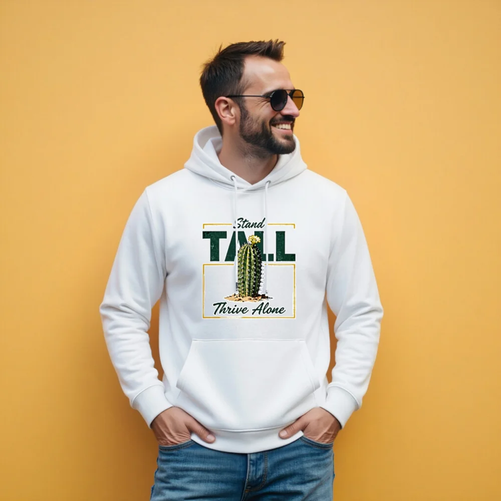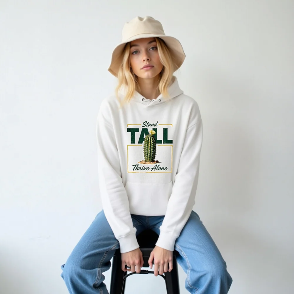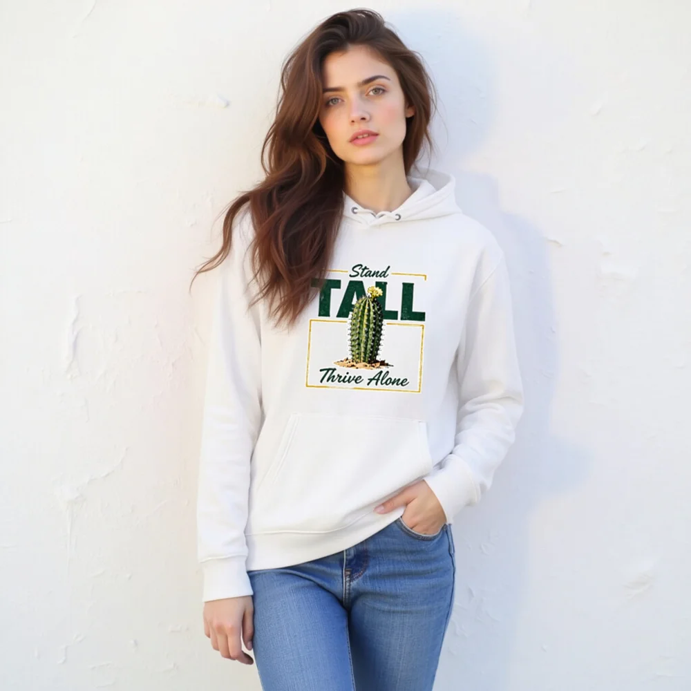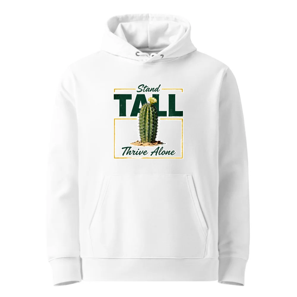 This unisex eco hoodie features a bold ‘Stand Tall, Thrive Alone’ cactus graphic—symbolizing resilience and independence. Made from sustainable, soft cotton blend fabric, it offers comfort and style for everyday wear. Perfect for nature lovers, minimalists, or anyone embracing self-reliance. The classic pullover design includes a front pocket, adjustable drawstring hood, and ribbed cuffs. Ethically produced with eco-conscious materials, this hoodie combines meaningful messaging with everyday functionality—ideal for casual outings, gifting, or quiet confidence.