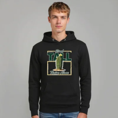 This unisex premium pullover hoodie features a bold ‘Stand Tall, Thrive Alone’ cactus graphic—symbolizing resilience and independence. Made from soft, durable fabric with a classic fit, front pouch pocket, and adjustable drawstring hood. Perfect for casual wear, gifting, or expressing individuality. Ideal for fans of minimalist desert aesthetics and motivational streetwear. Machine washable, comfortable for all seasons. A statement piece that blends style, comfort, and empowering messaging—designed to stand out while staying true to yourself.