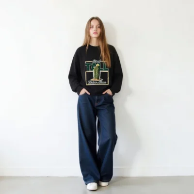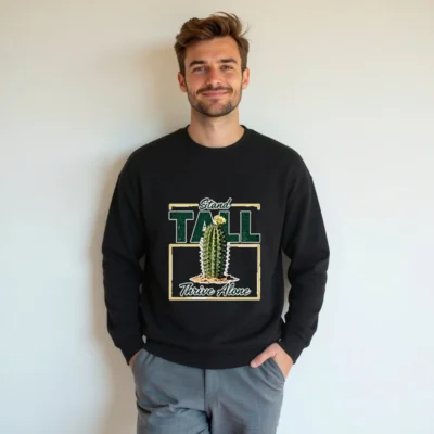This black unisex crew neck sweatshirt features a bold, vintage-inspired graphic: a resilient cactus blooming in sand, framed by the empowering phrase ‘Stand Tall, Thrive Alone’. Designed for comfort and statement-making style, it’s made from soft cotton-blend fabric with ribbed cuffs and hem. Perfect for casual wear, gifting, or expressing independence and strength. Ideal for fans of minimalist desert aesthetics, motivational apparel, and gender-neutral fashion. Machine washable and durable for everyday wear.