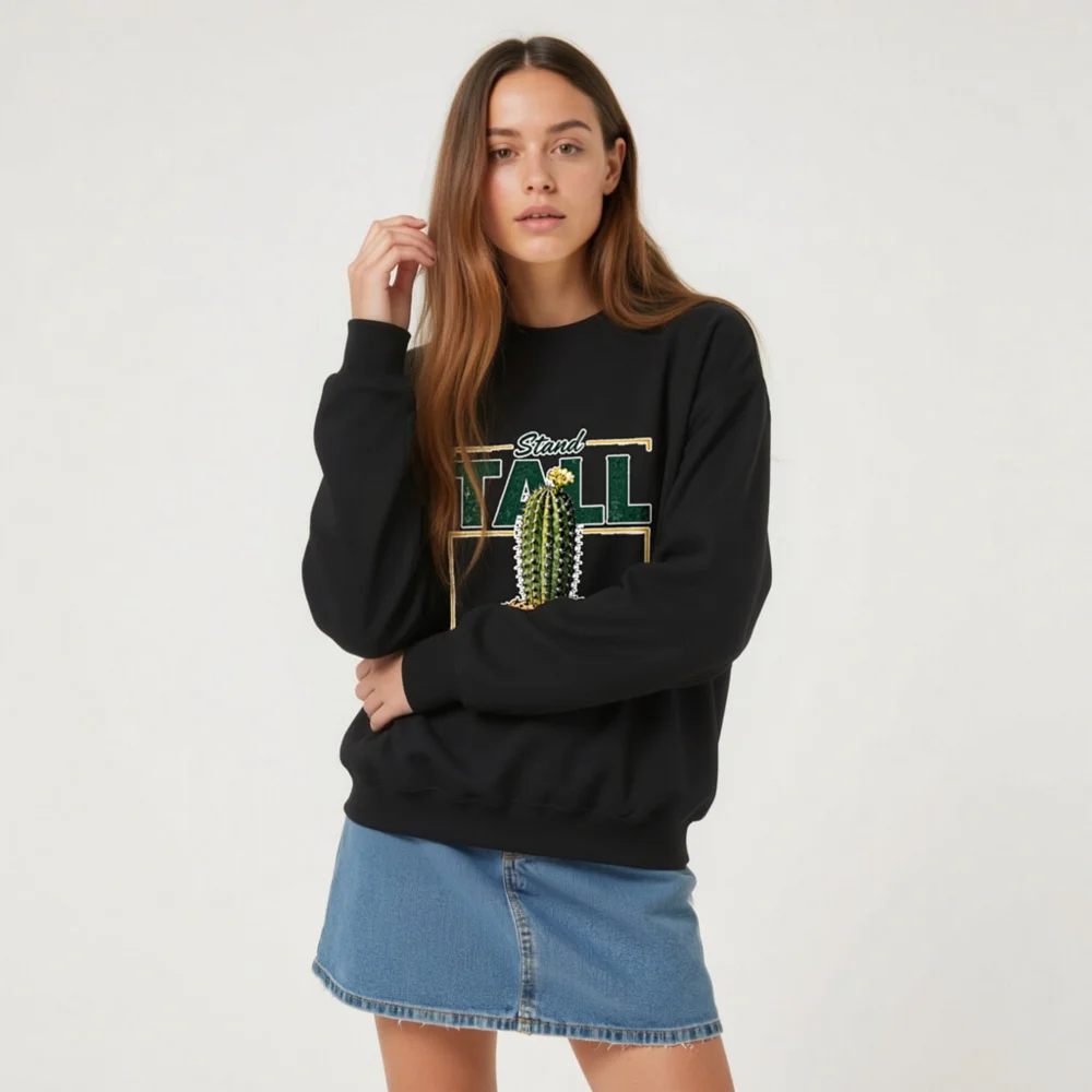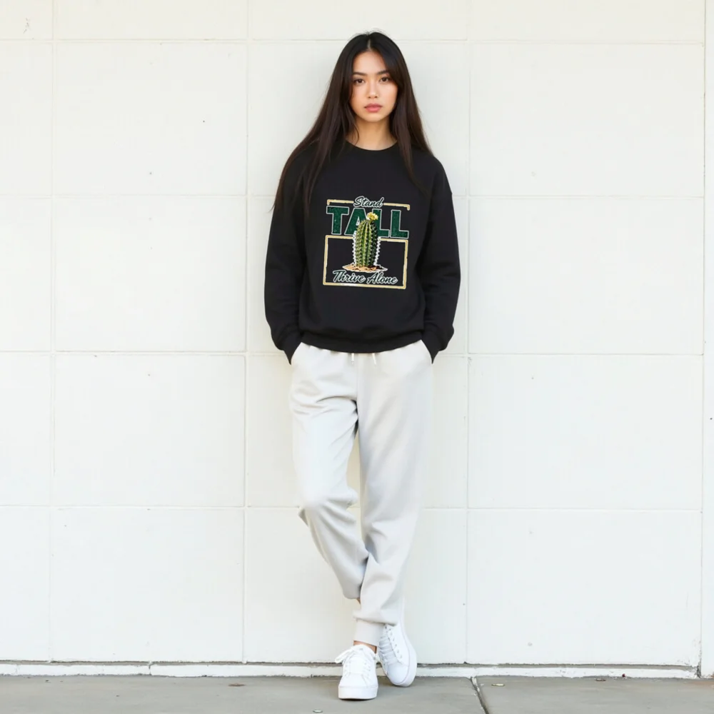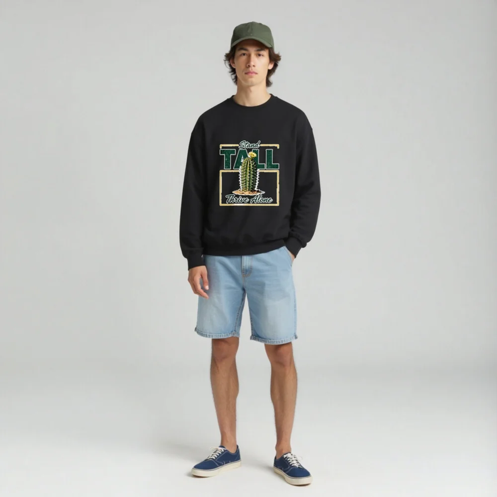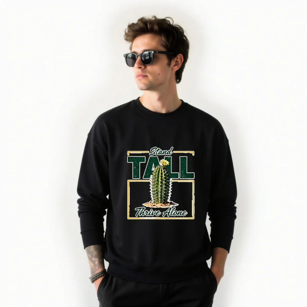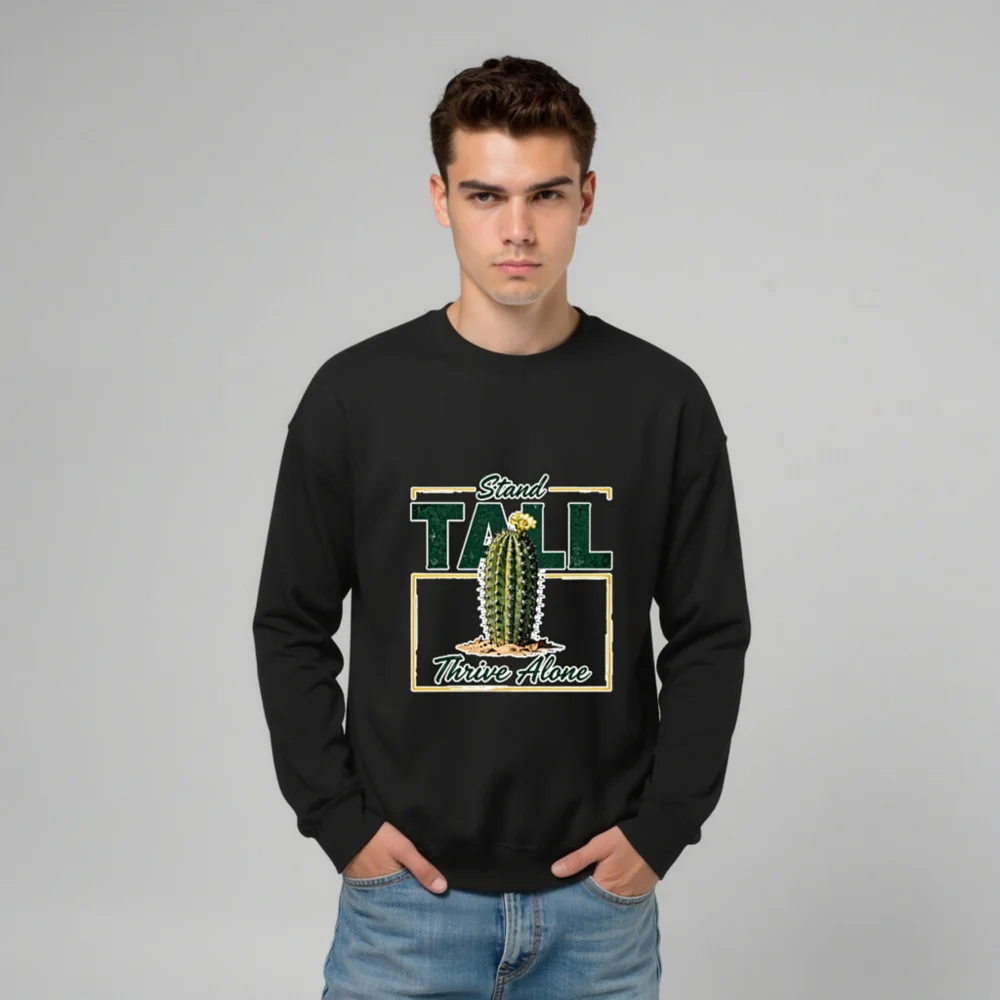 This black unisex crew neck sweatshirt features a bold, vintage-inspired graphic: a resilient cactus blooming in sand, framed by the empowering phrase ‘Stand Tall, Thrive Alone’. Designed for comfort and statement-making style, it’s made from soft cotton-blend fabric with ribbed cuffs and hem. Perfect for casual wear, gifting, or expressing independence and strength. Ideal for fans of minimalist desert aesthetics, motivational apparel, and gender-neutral fashion. Machine washable and durable for everyday wear.