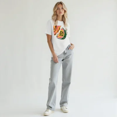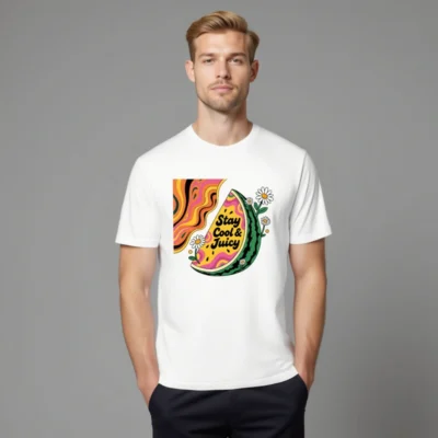 Vibrant watermelon slice graphic with psychedelic swirls and daisies on a classic white unisex staple t-shirt. ‘Stay Cool & Juicy’ text adds playful summer charm. Soft, comfortable cotton blend—ideal for casual wear. Perfect for fans of retro-futuristic fruit art. Designed for everyday comfort and bold self-expression.