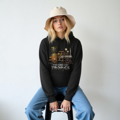 This premium unisex pullover hoodie features a striking steampunk pineapple train design—where a golden pineapple serves as the engine, surrounded by brass gears, copper pipes, and vintage gauges. ‘Powered by Tropics’ text adds playful flair. Made for comfort and style, this hoodie blends tropical whimsy with industrial charm. Ideal for fans of quirky fashion, retro-futurism, and unique apparel.
