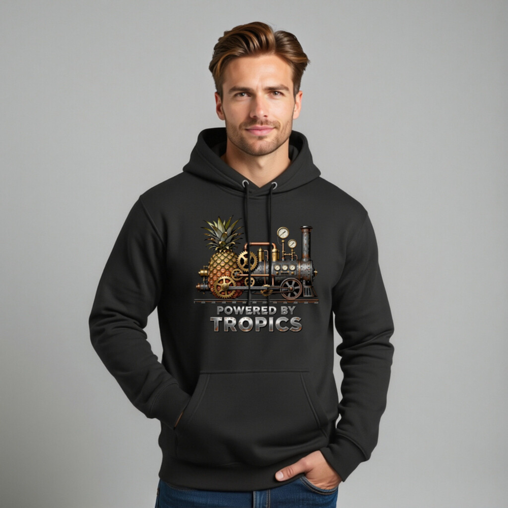 This premium unisex pullover hoodie features a striking steampunk pineapple train design—where a golden pineapple serves as the engine, surrounded by brass gears, copper pipes, and vintage gauges. ‘Powered by Tropics’ text adds playful flair. Made for comfort and style, this hoodie blends tropical whimsy with industrial charm. Ideal for fans of quirky fashion, retro-futurism, and unique apparel.