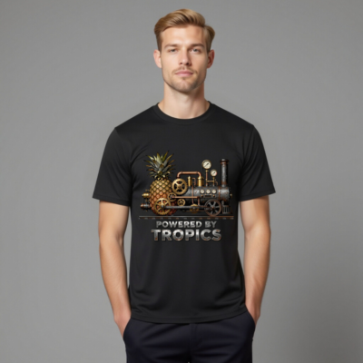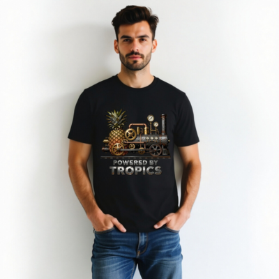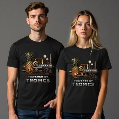 This unisex organic cotton t-shirt features a striking steampunk pineapple train design—gears, brass pipes, and vintage gauges fused with a tropical pineapple engine. The bold ‘Powered by Tropics’ slogan adds playful flair. Made from certified organic cotton for comfort and sustainability. Ideal for steam enthusiasts, tropical lovers, and fashion-forward wearers seeking unique, high-quality apparel.