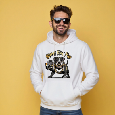 Show off the bold ‘Street King Pup’ design: a fierce bulldog with gold chain, blaring boombox, and fiery details. This unisex essential hoodie is made from eco-friendly materials for comfort and sustainability. Perfect for streetwear lovers seeking attitude and authenticity. Wear your style—sustainably.