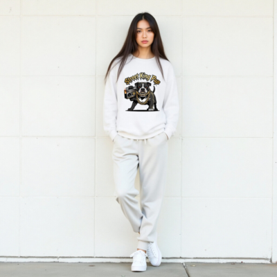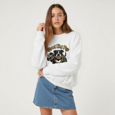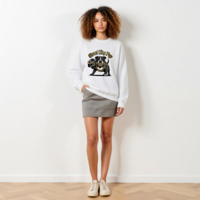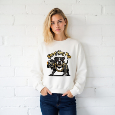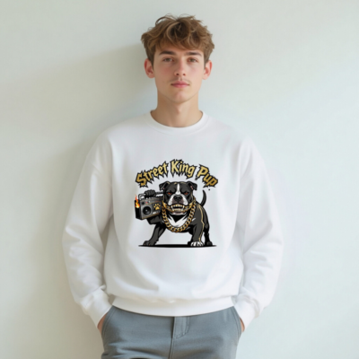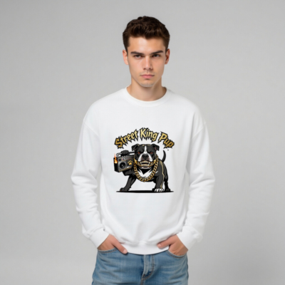 Show off your street cred with this unisex crew neck sweatshirt featuring the fierce ‘Street King Pup’ design: a black-and-white bulldog gripping a flaming boombox, adorned with a thick gold chain and bold graffiti-style typography. Made for everyday wear, this premium sweatshirt delivers comfort and attitude. Perfect for dog lovers, hip-hop fans, and anyone who rocks urban street style. Machine washable, soft cotton blend, one-size-fits-most.