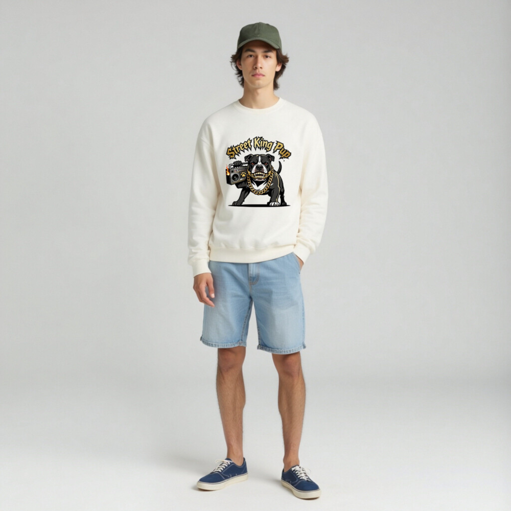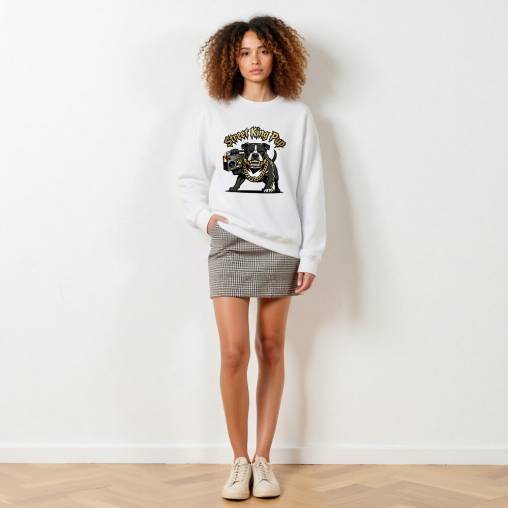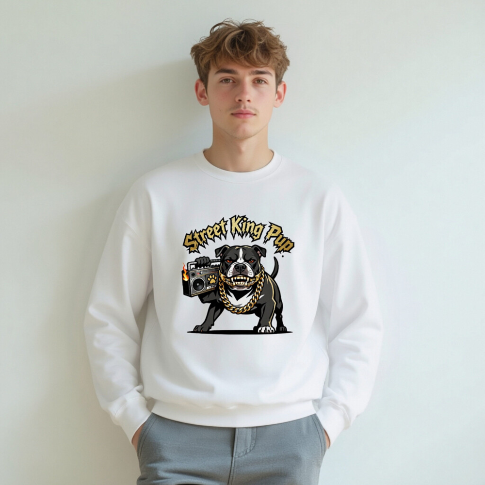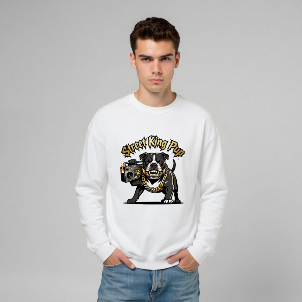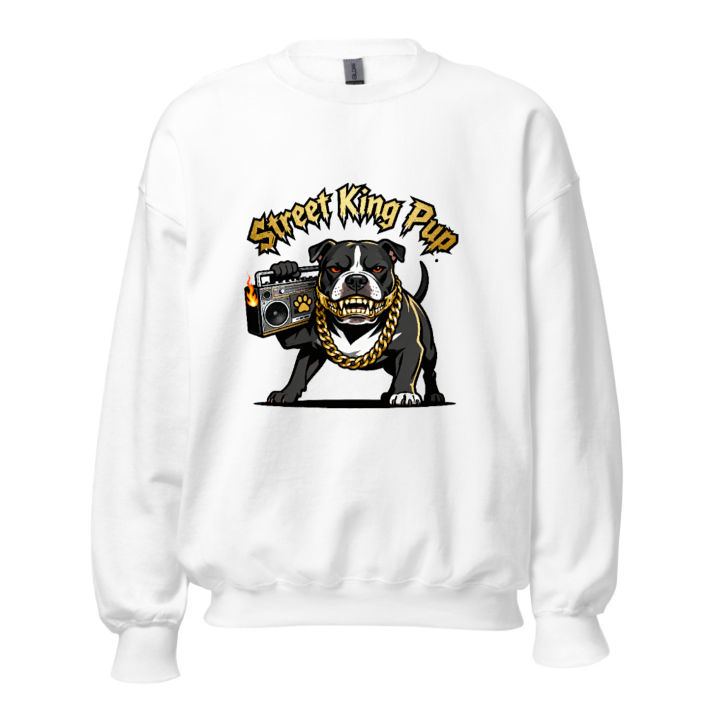 Street King Pup Unisex Crew Neck Sweatshirt – Bold Bulldog with Gold Chain & Boombox Design