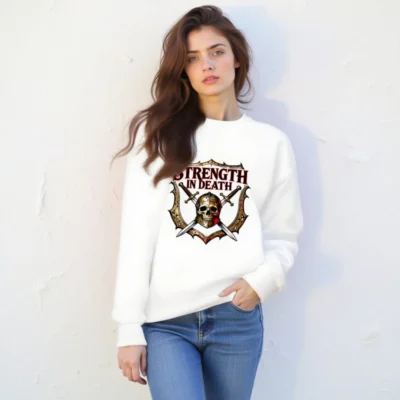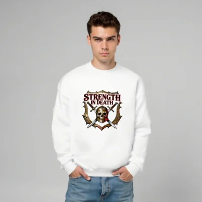 Unisex crew neck sweatshirt featuring bold ‘STRENGTH IN DEATH’ graphic: a skull in helmet, crossed swords, and ornate shield—ideal for gamers, fantasy fans, and dark aesthetic lovers. Soft cotton blend, comfortable fit, versatile for everyday wear. Designed for those who embrace resilience through adversity.