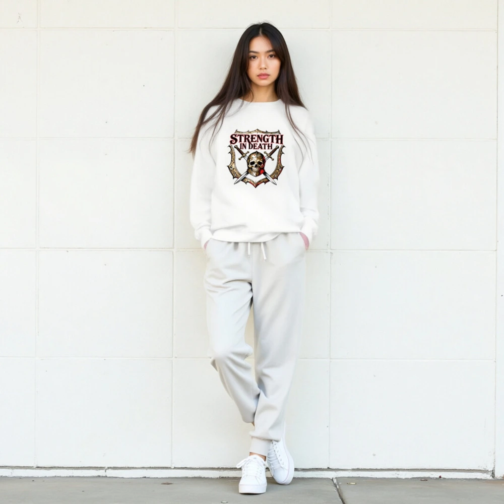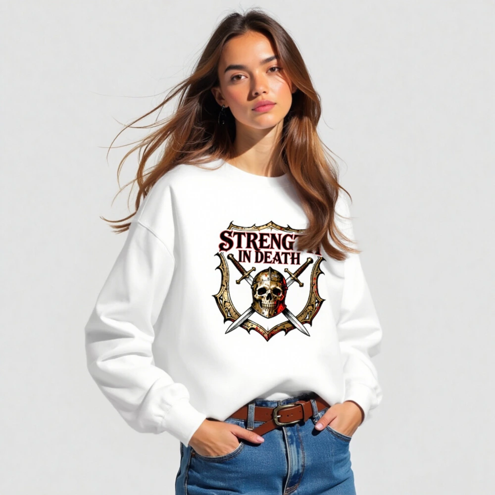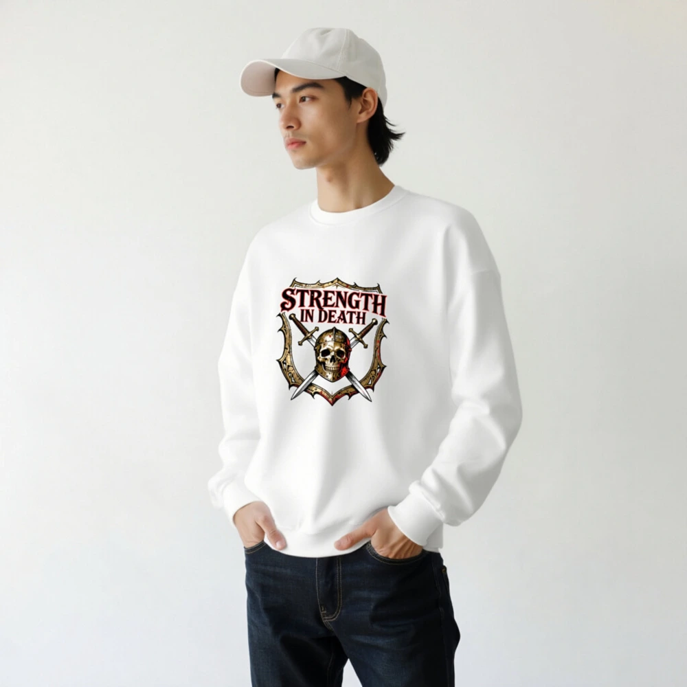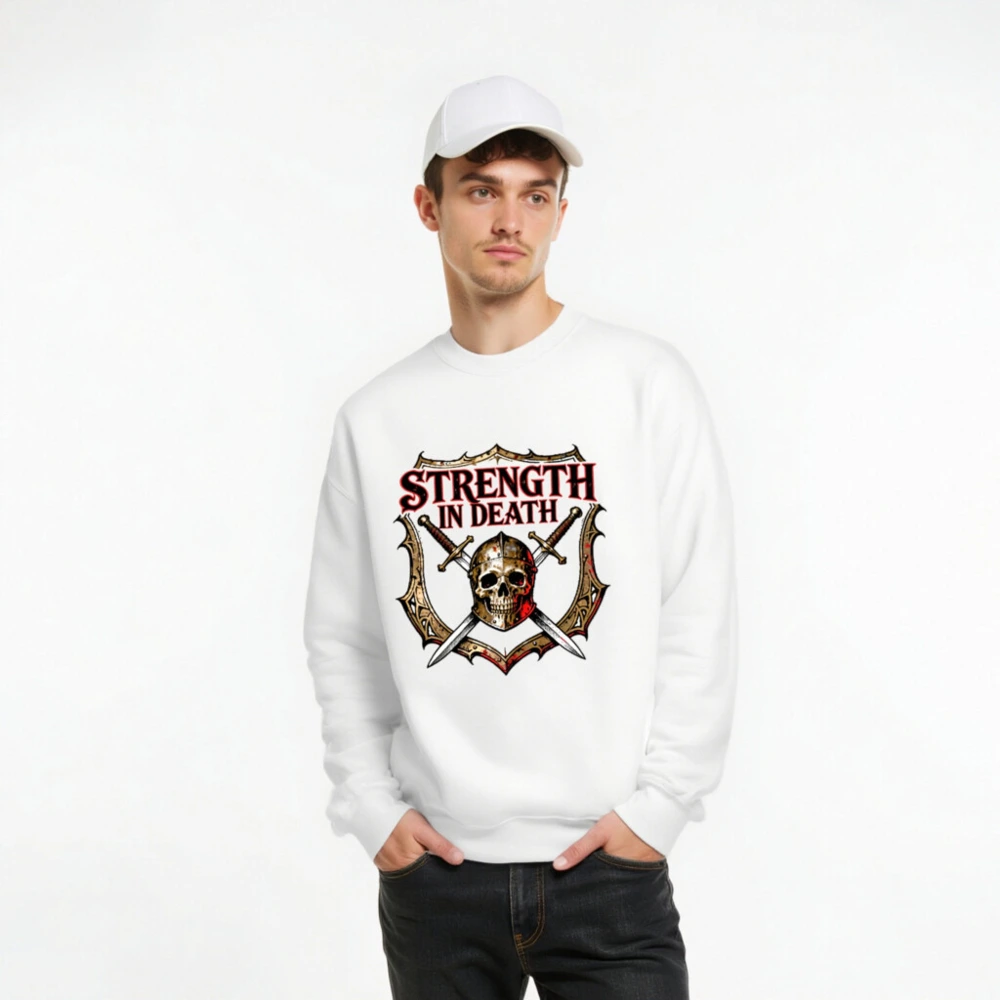 Unisex crew neck sweatshirt featuring bold ‘STRENGTH IN DEATH’ graphic: a skull in helmet, crossed swords, and ornate shield—ideal for gamers, fantasy fans, and dark aesthetic lovers. Soft cotton blend, comfortable fit, versatile for everyday wear. Designed for those who embrace resilience through adversity.