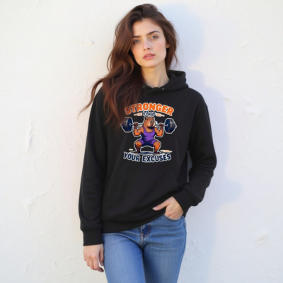 Show your grit with this unisex essential eco hoodie featuring a bold capybara lifting weights and the motivational phrase ‘Stronger Than Your Excuses’. Made from sustainable materials, it’s soft, comfortable, and designed for everyday wear. Perfect for fitness lovers, gym enthusiasts, and anyone who values both style and sustainability. Lightweight, durable, and machine-washable — your daily dose of motivation in a cozy hoodie.