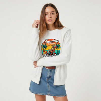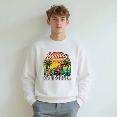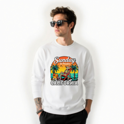 Relax in style with this unisex crew neck sweatshirt featuring a vibrant ‘Sunday in Paradise California’ design: a skeleton lounging in a beach chair under palm trees, sunset hues, and tropical fruit. Perfect for laid-back vibes, casual wear, or Day of the Dead homage. Soft cotton blend, comfortable fit, ideal for all seasons.