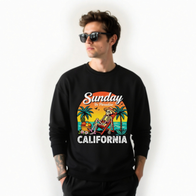 Relax in paradise with this unisex crew neck sweatshirt featuring a vibrant vintage-style skeleton lounging in a beach chair under palm trees, with ‘Sunday in Paradise’ and ‘CALIFORNIA’ text. Perfect for casual wear, summer vibes, and California lovers. Soft, comfortable fit—ideal for everyday comfort and fun fashion.