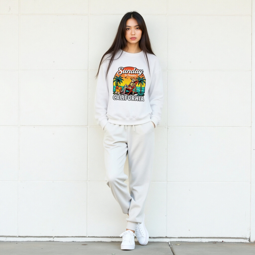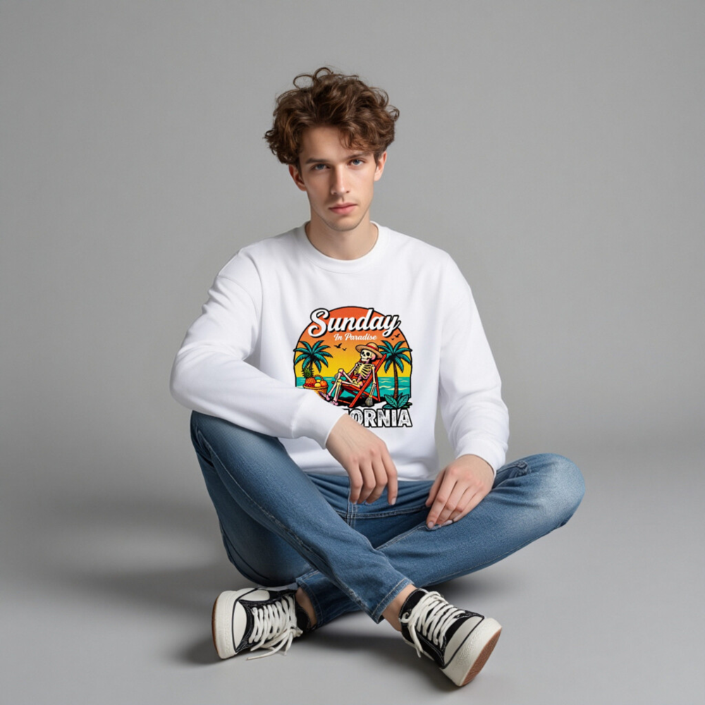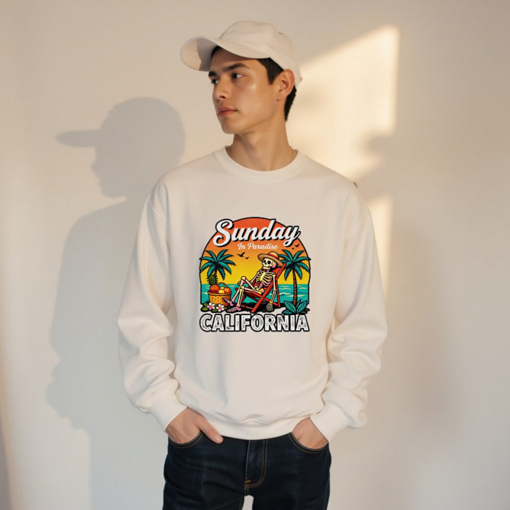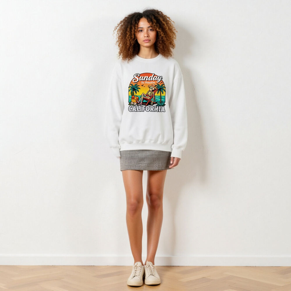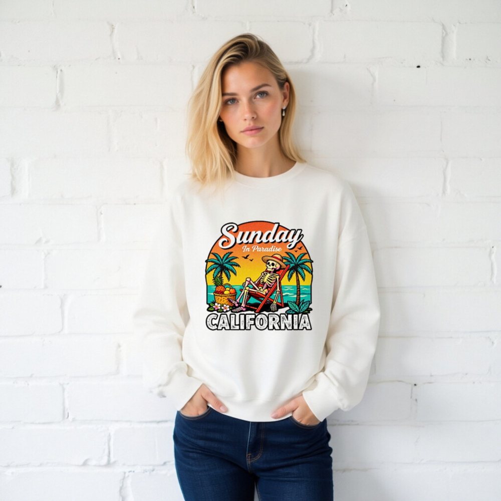 Relax in style with this unisex crew neck sweatshirt featuring a vibrant ‘Sunday in Paradise California’ design: a skeleton lounging in a beach chair under palm trees, sunset hues, and tropical fruit. Perfect for laid-back vibes, casual wear, or Day of the Dead homage. Soft cotton blend, comfortable fit, ideal for all seasons.