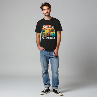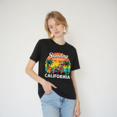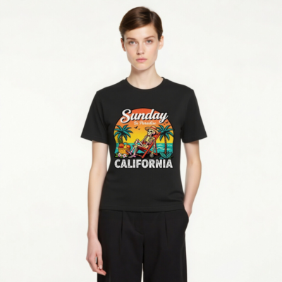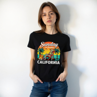 Relax in style with this unisex staple t-shirt featuring a vibrant ‘Sunday in Paradise California’ design: a skeleton in a straw hat lounging on a beach chair, flanked by palm trees, tropical fruits, and a sunset backdrop. Perfect for casual wear, this classic fit tee combines retro vintage aesthetics with playful Halloween charm—ideal for beach lovers and California fans. Machine washable, soft cotton blend, true to size.