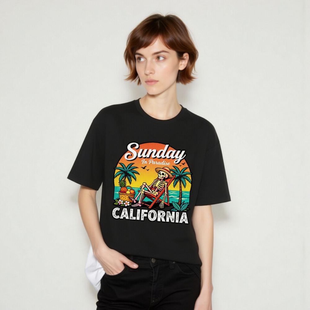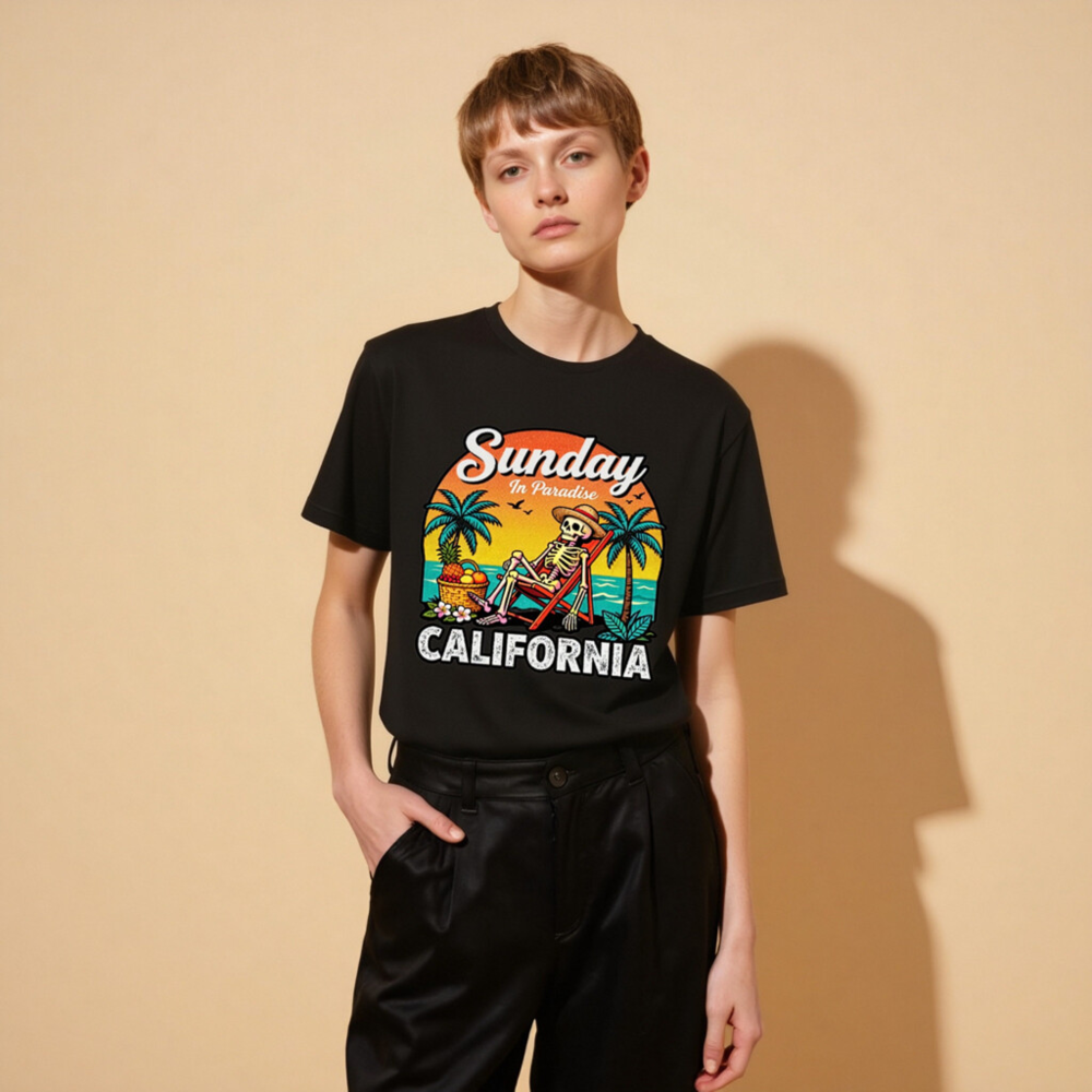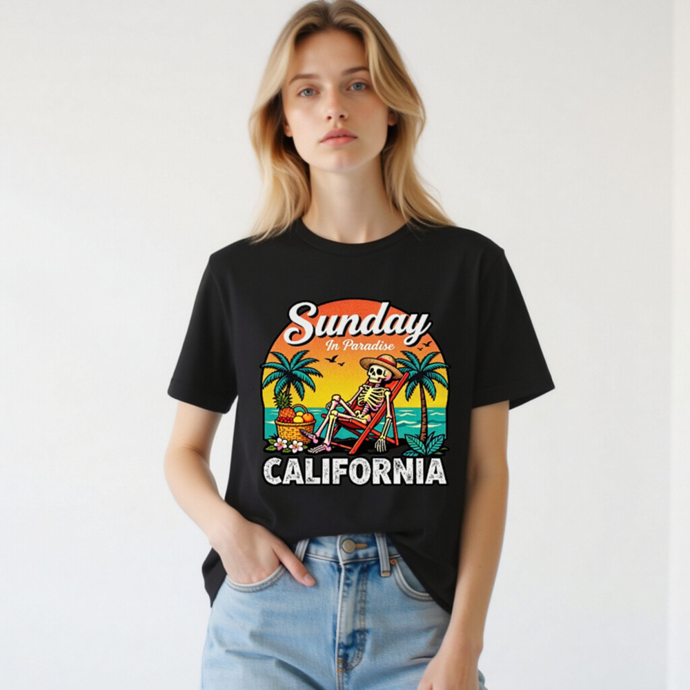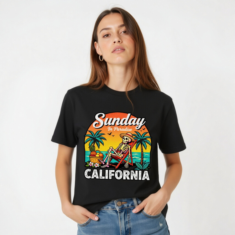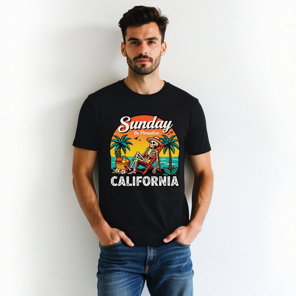 Relax in style with this unisex staple t-shirt featuring a vibrant ‘Sunday in Paradise California’ design: a skeleton in a straw hat lounging on a beach chair, flanked by palm trees, tropical fruits, and a sunset backdrop. Perfect for casual wear, this classic fit tee combines retro vintage aesthetics with playful Halloween charm—ideal for beach lovers and California fans. Machine washable, soft cotton blend, true to size.