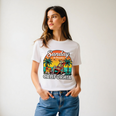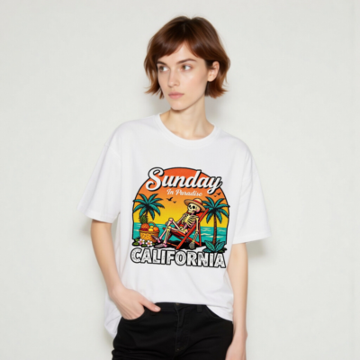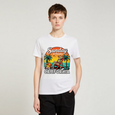 Relax in paradise with this fun, unisex organic cotton t-shirt featuring a retro skeleton lounging on a beach chair under palm trees. The vibrant ‘Sunday In Paradise’ design with ‘CALIFORNIA’ bold lettering captures laid-back coastal vibes. Made from certified organic cotton for comfort and sustainability. Perfect for beach days, vacation memories, or everyday casual wear.
