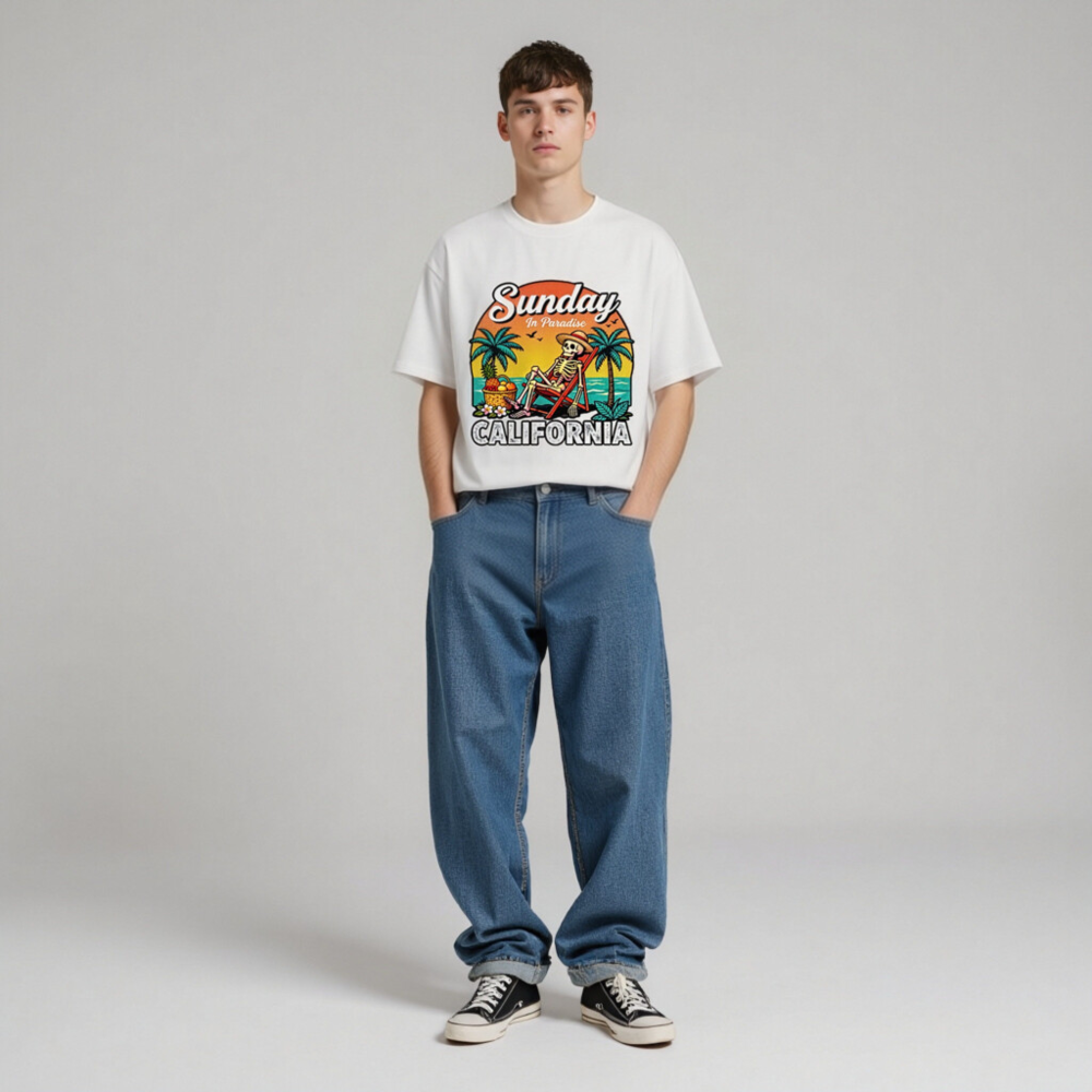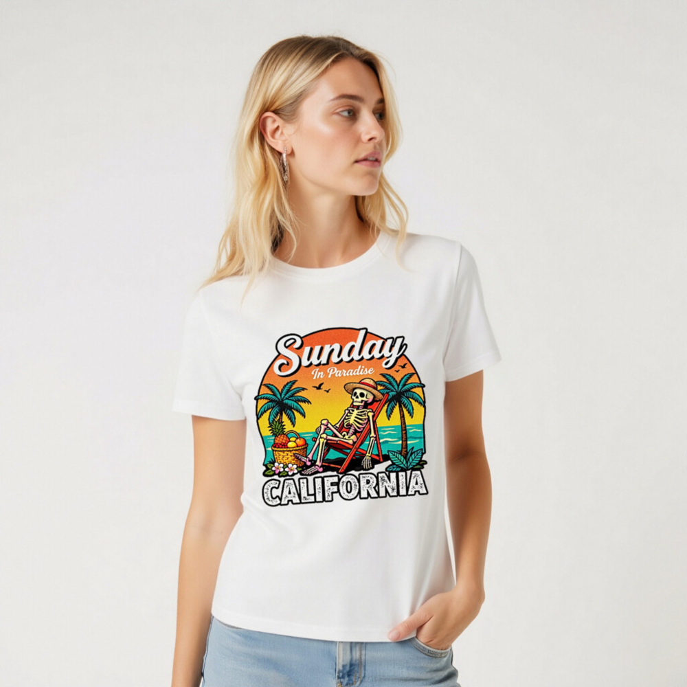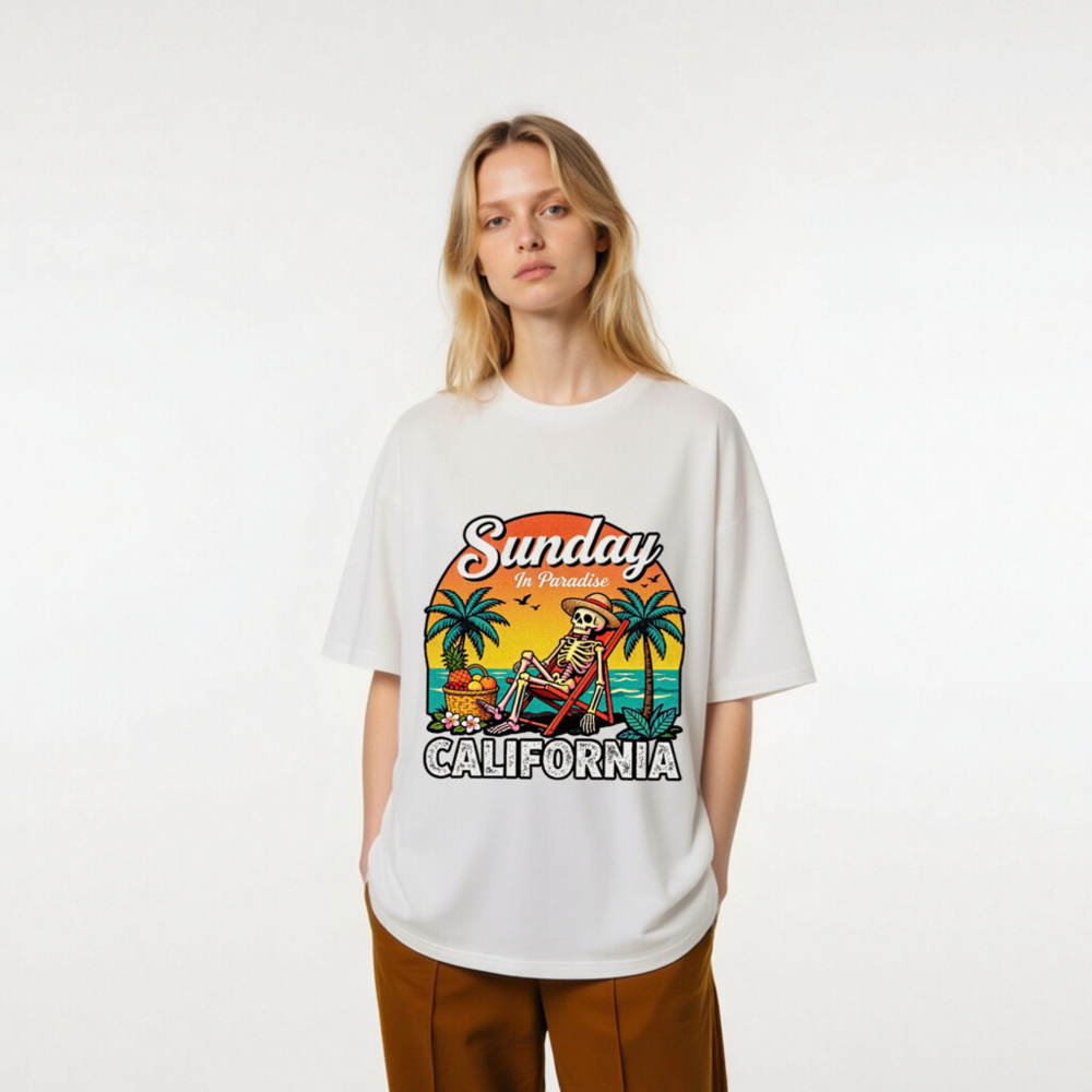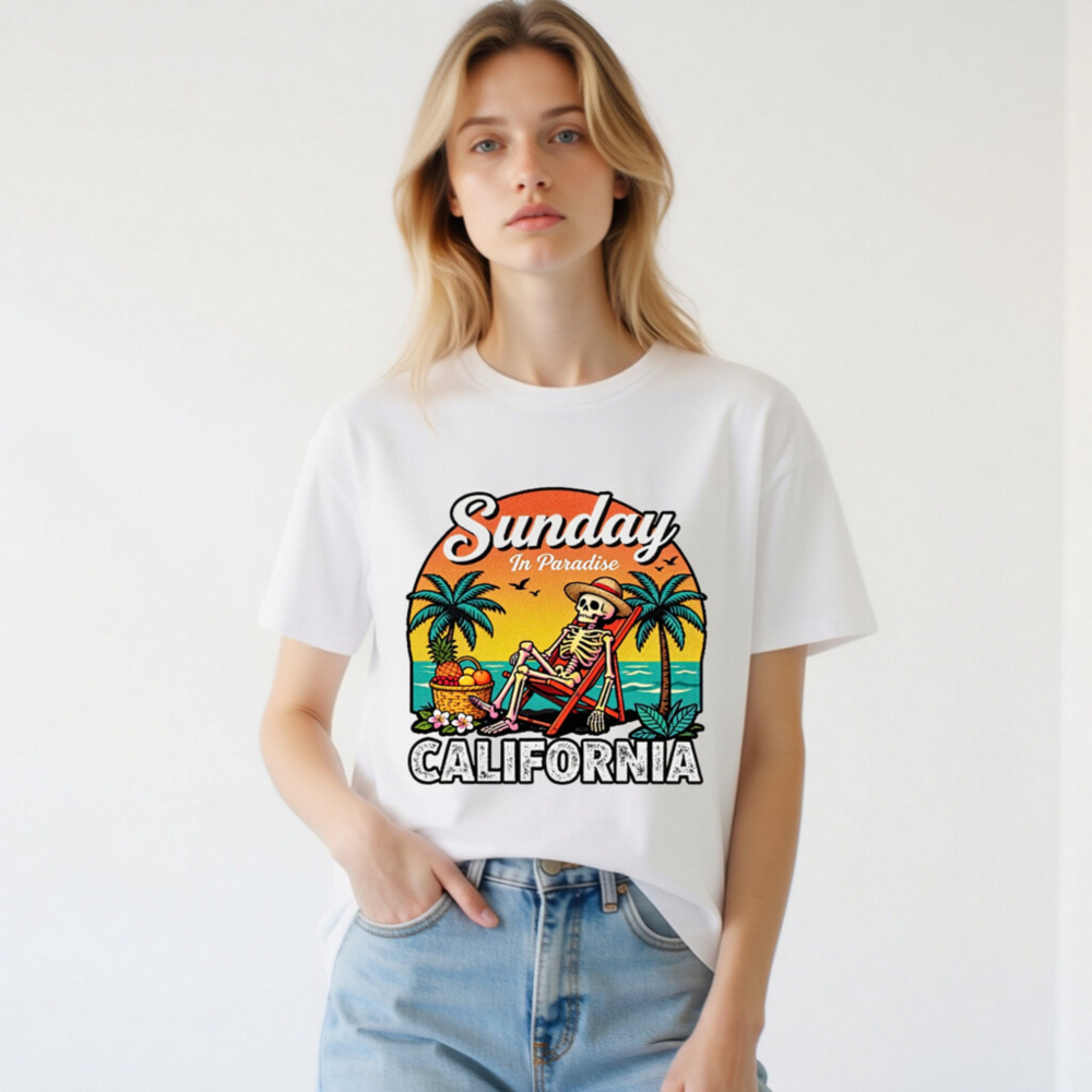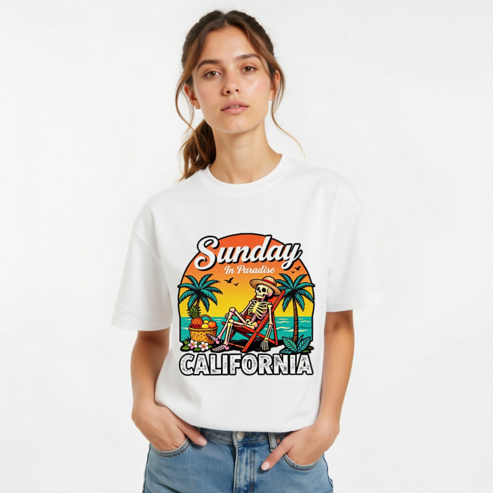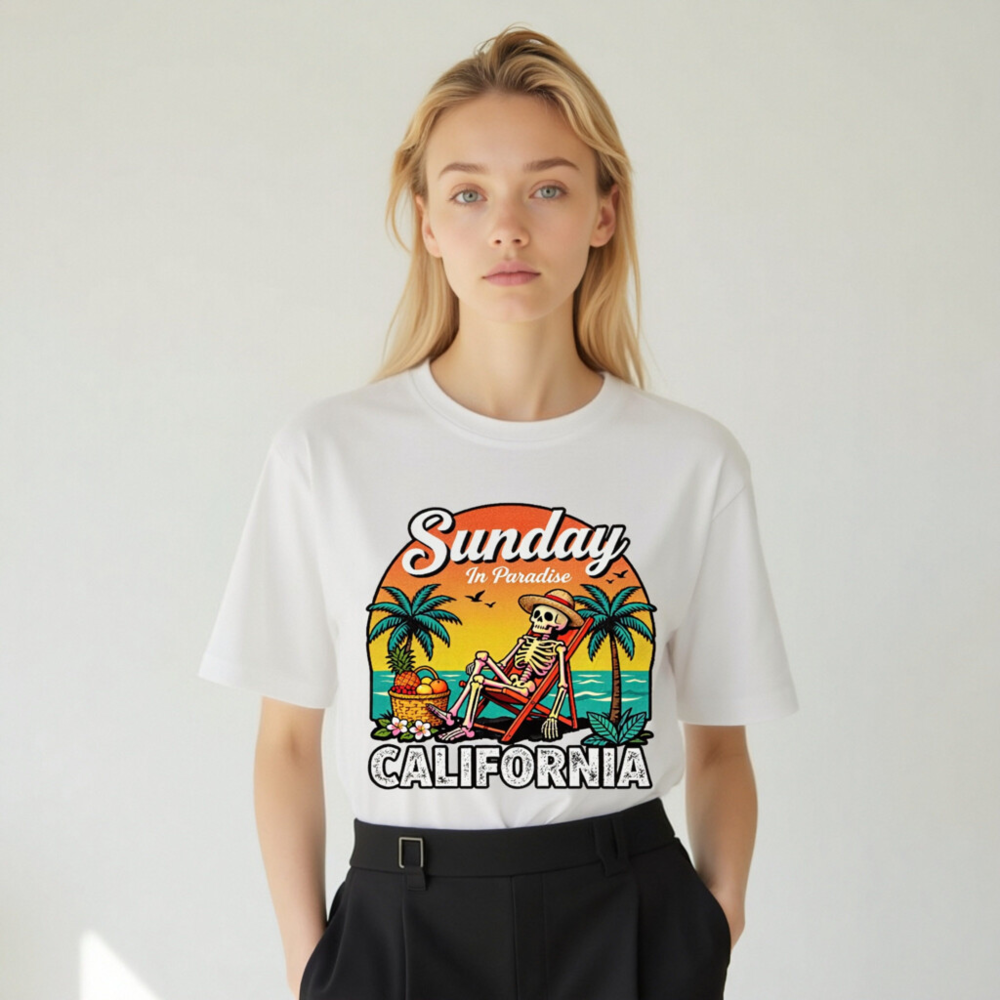 Relax in paradise with this fun, unisex organic cotton t-shirt featuring a retro skeleton lounging on a beach chair under palm trees. The vibrant ‘Sunday In Paradise’ design with ‘CALIFORNIA’ bold lettering captures laid-back coastal vibes. Made from certified organic cotton for comfort and sustainability. Perfect for beach days, vacation memories, or everyday casual wear.