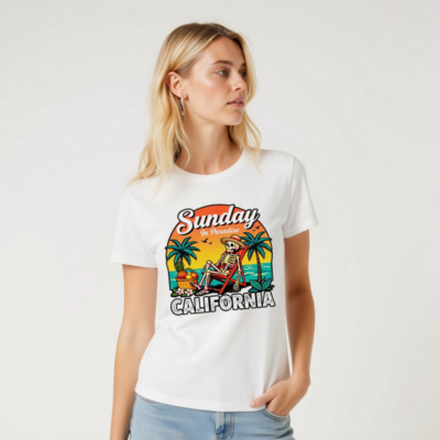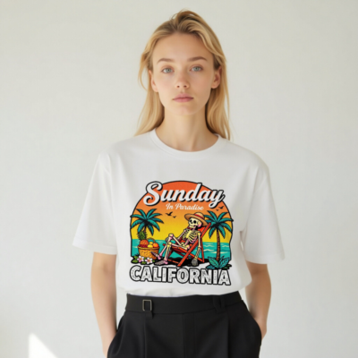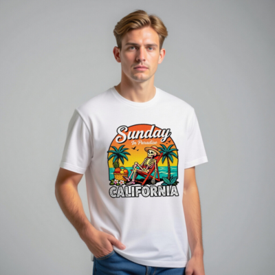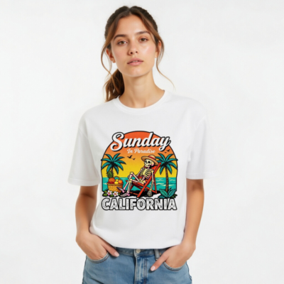 Relax in paradise with this unisex staple t-shirt featuring a vintage-style skeleton lounging on a beach chair under palm trees, set against a sunset backdrop. ‘Sunday in Paradise California’ text adds playful coastal charm. Soft, comfortable cotton blend—ideal for casual wear. Perfect gift for beach lovers and California enthusiasts. Free shipping on orders over $30.