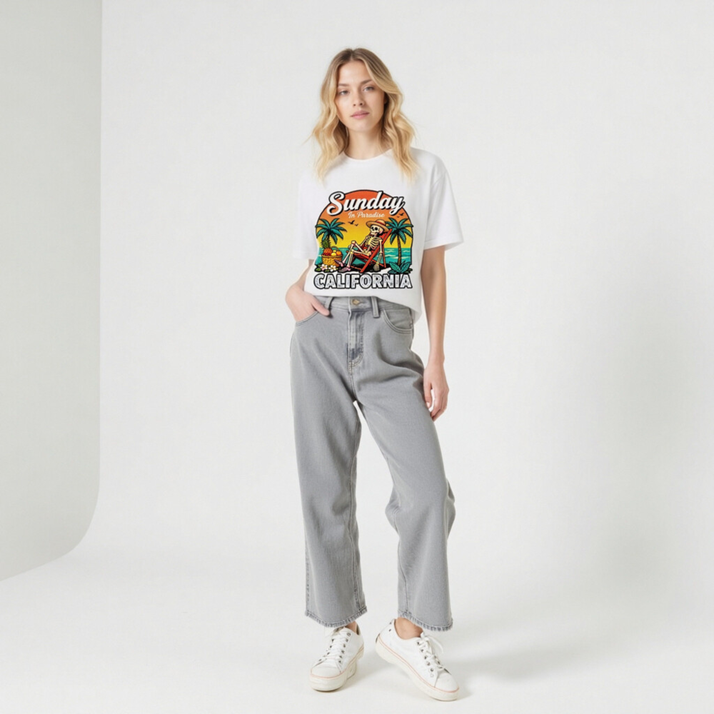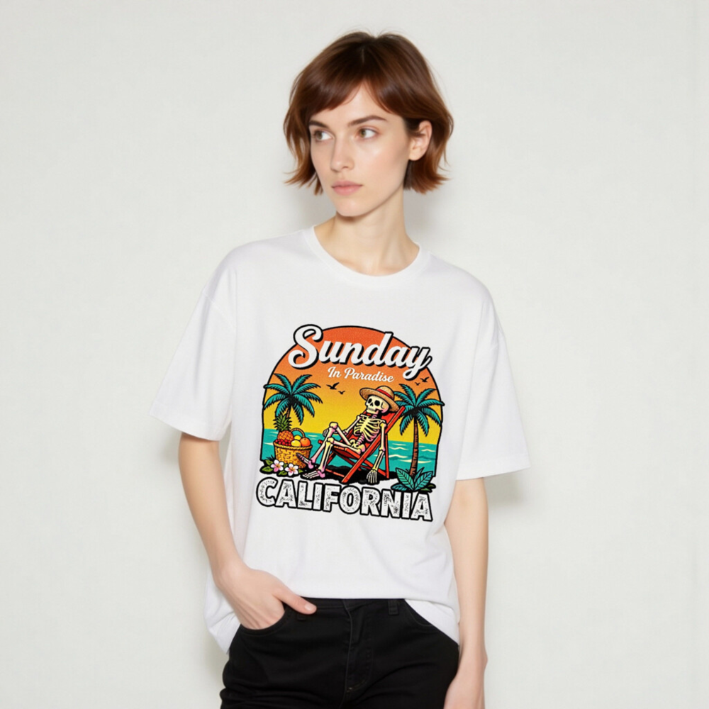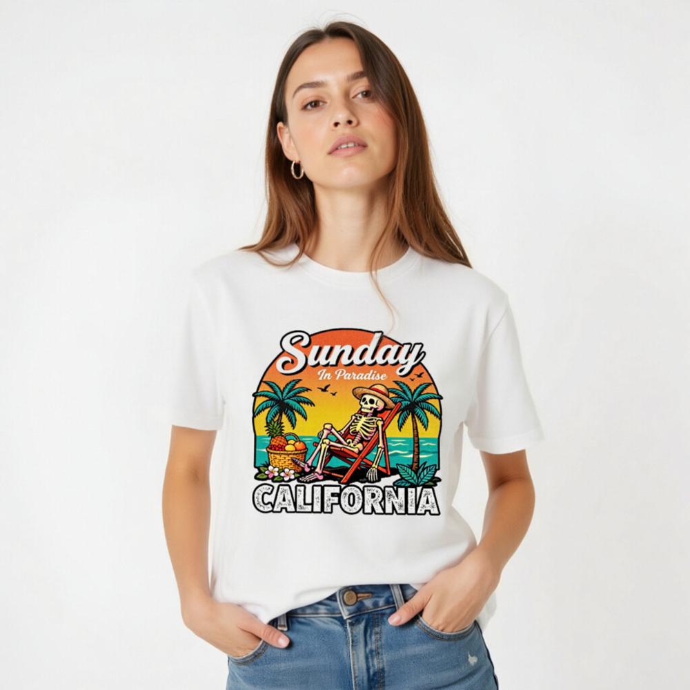 Relax in paradise with this unisex staple t-shirt featuring a vintage-style skeleton lounging on a beach chair under palm trees, set against a sunset backdrop. ‘Sunday in Paradise California’ text adds playful coastal charm. Soft, comfortable cotton blend—ideal for casual wear. Perfect gift for beach lovers and California enthusiasts. Free shipping on orders over $30.
