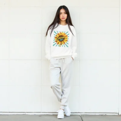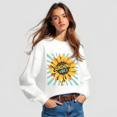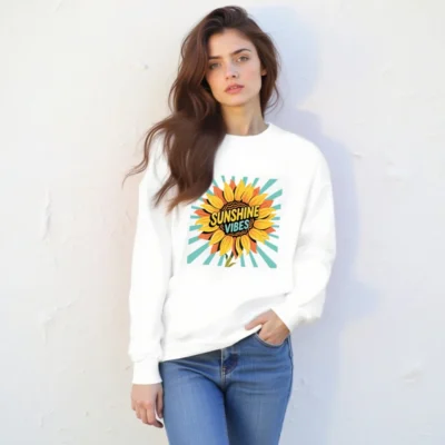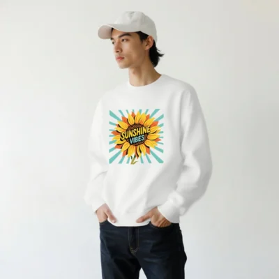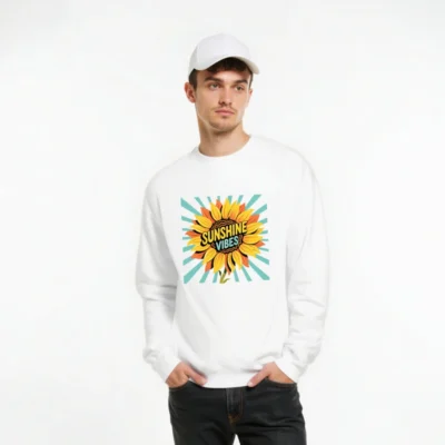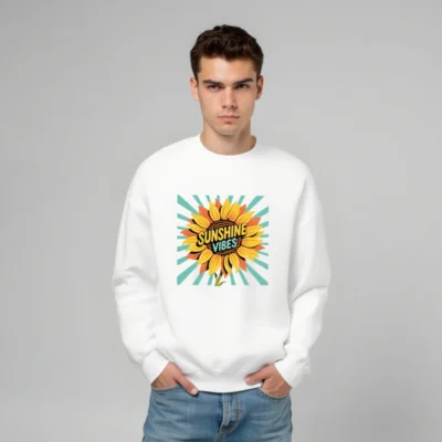 Brighten your day with this unisex crew neck sweatshirt featuring a vibrant sunflower graphic and ‘Sunshine Vibes’ text against retro teal rays. Made for everyday comfort, it’s a cheerful, versatile piece perfect for casual wear. Soft, relaxed fit—ideal for layering or wearing alone. Designed to uplift mood and style.