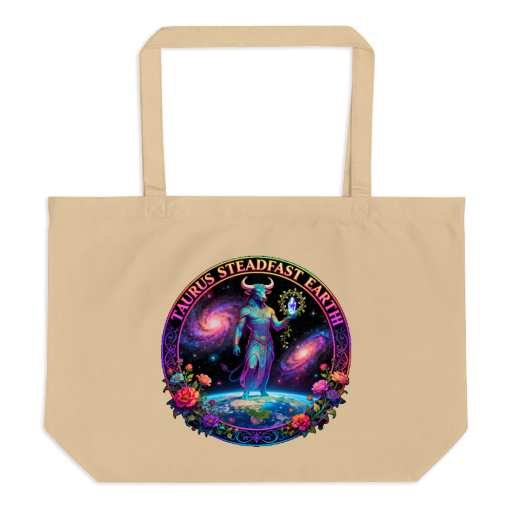 A large, eco-friendly organic cotton tote bag featuring a vibrant cosmic Taurus figure standing atop Earth, surrounded by galaxies and floral wreath. This sustainable canvas bag embodies earthy strength and celestial harmony—perfect for everyday use with zero-waste values. Made from responsibly sourced organic cotton, it’s durable, stylish, and kind to the planet.