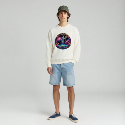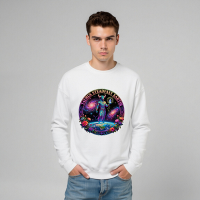 Celebrate Taurus with this unisex crew neck sweatshirt featuring a vibrant, cosmic design: a blue bull standing atop Earth against swirling galaxies, encircled by colorful flowers and the phrase ‘TAURUS STEADFAST EARTH’. Soft, comfortable fit for everyday wear. Ideal for astrology lovers and zodiac enthusiasts seeking meaningful, artistic apparel.