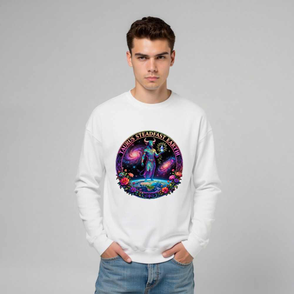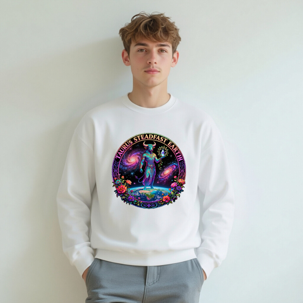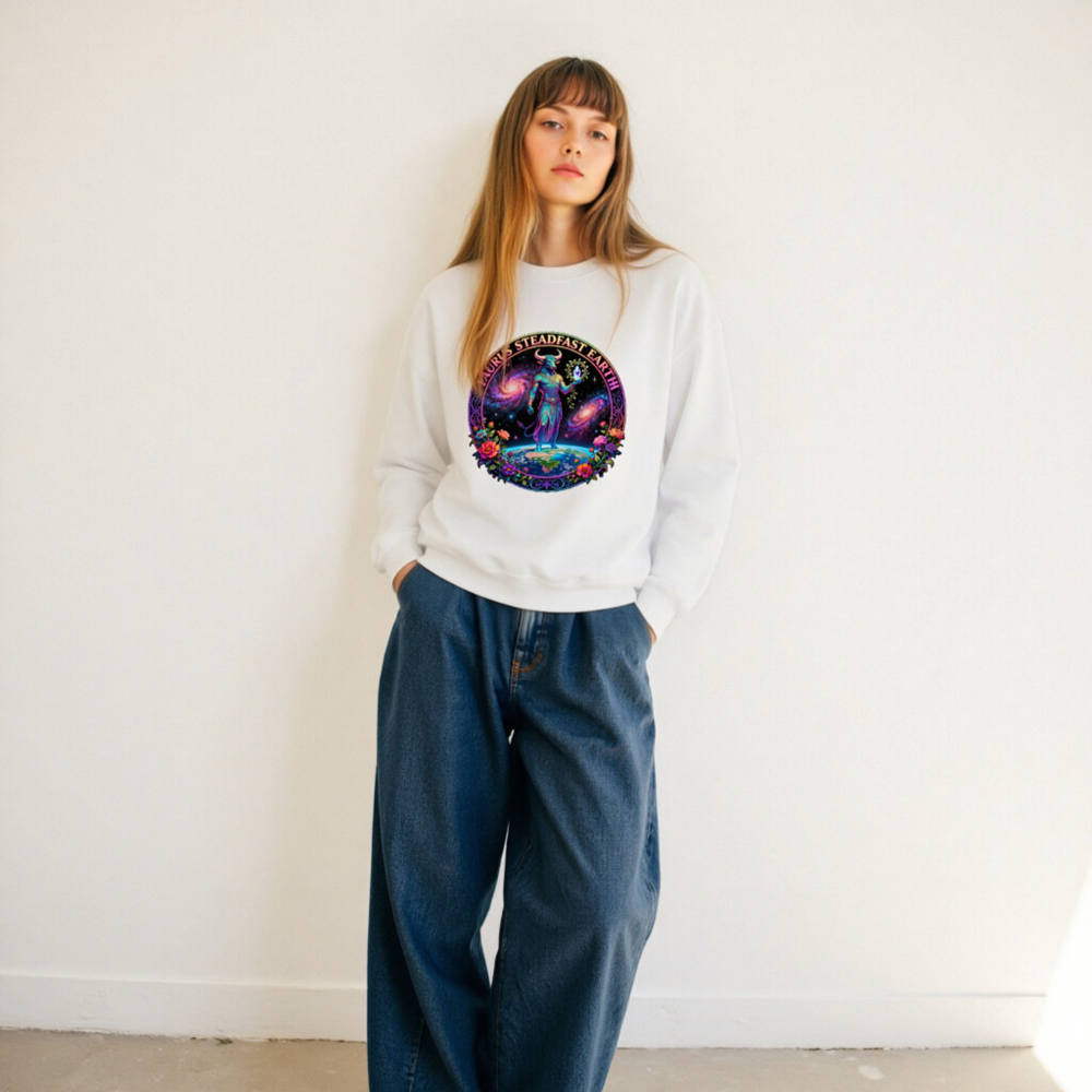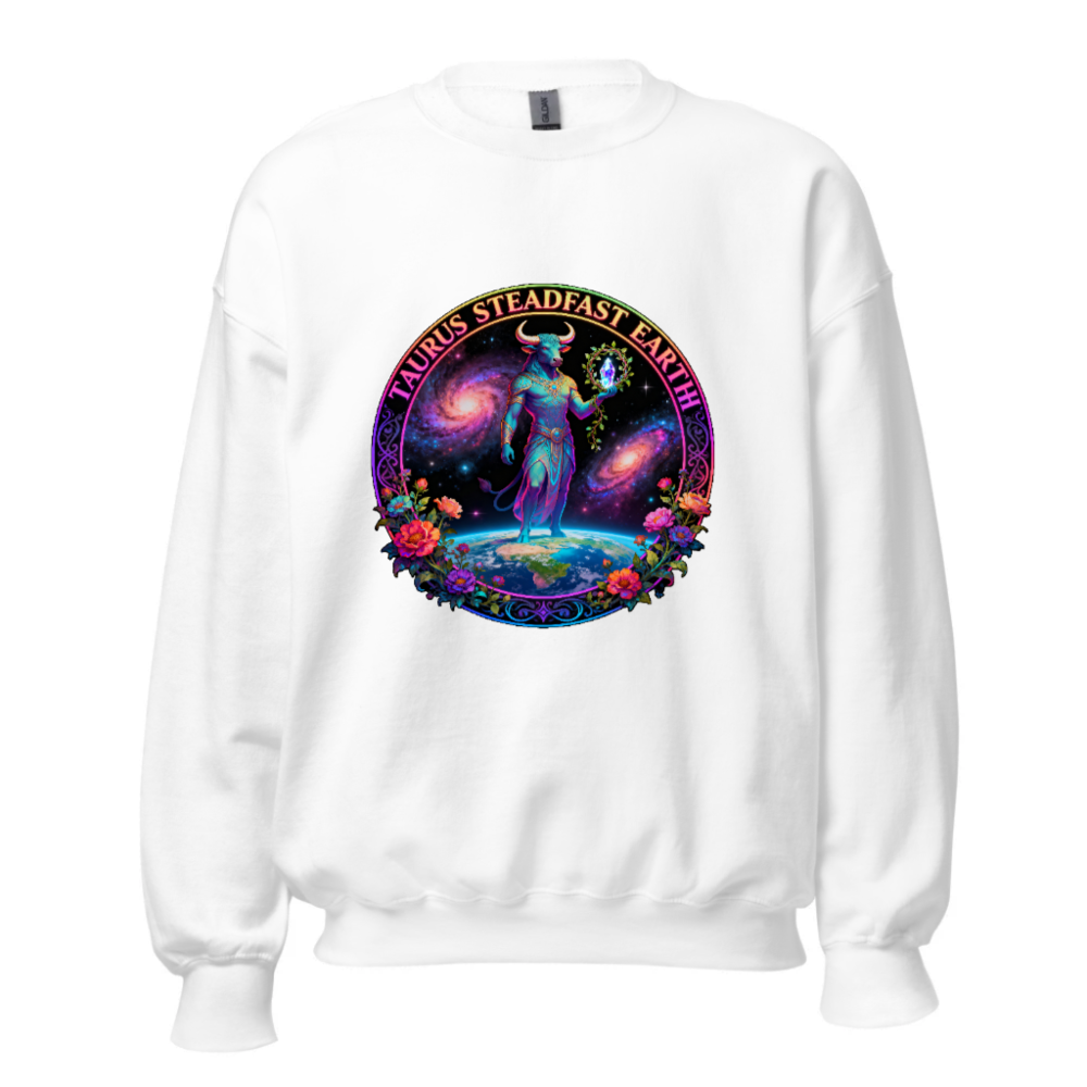 Taurus Steadfast Earth Unisex Crew Neck Sweatshirt – Cosmic Bull, Galaxy & Floral Design
