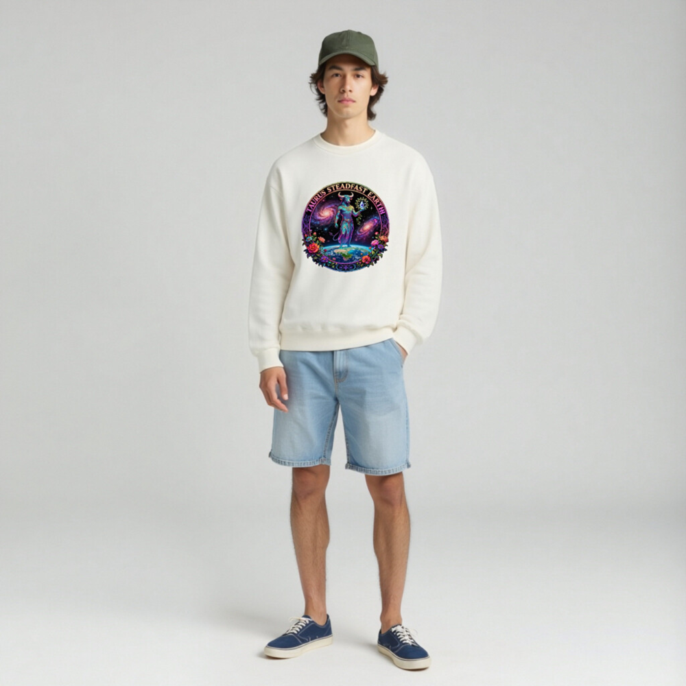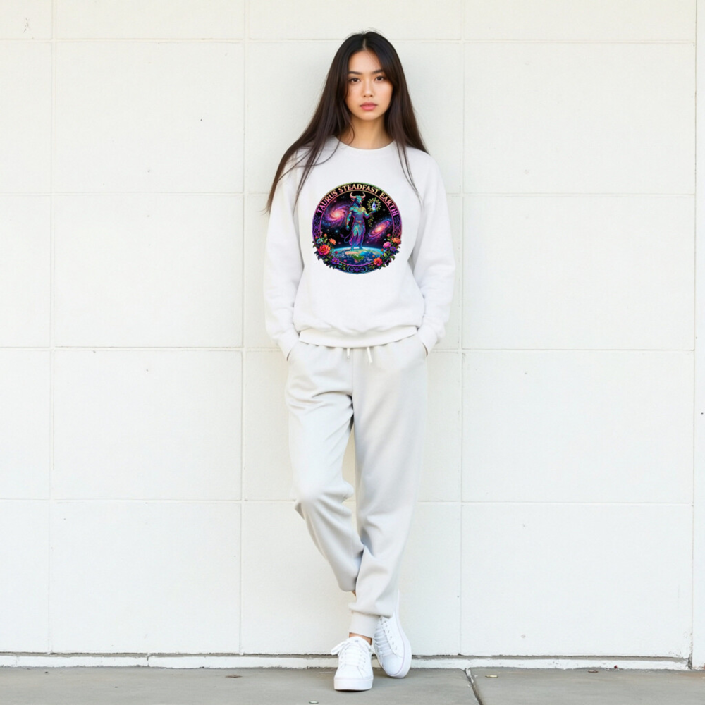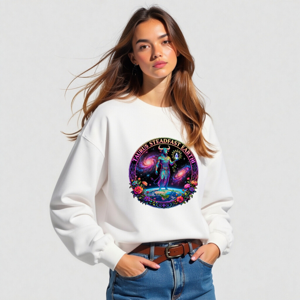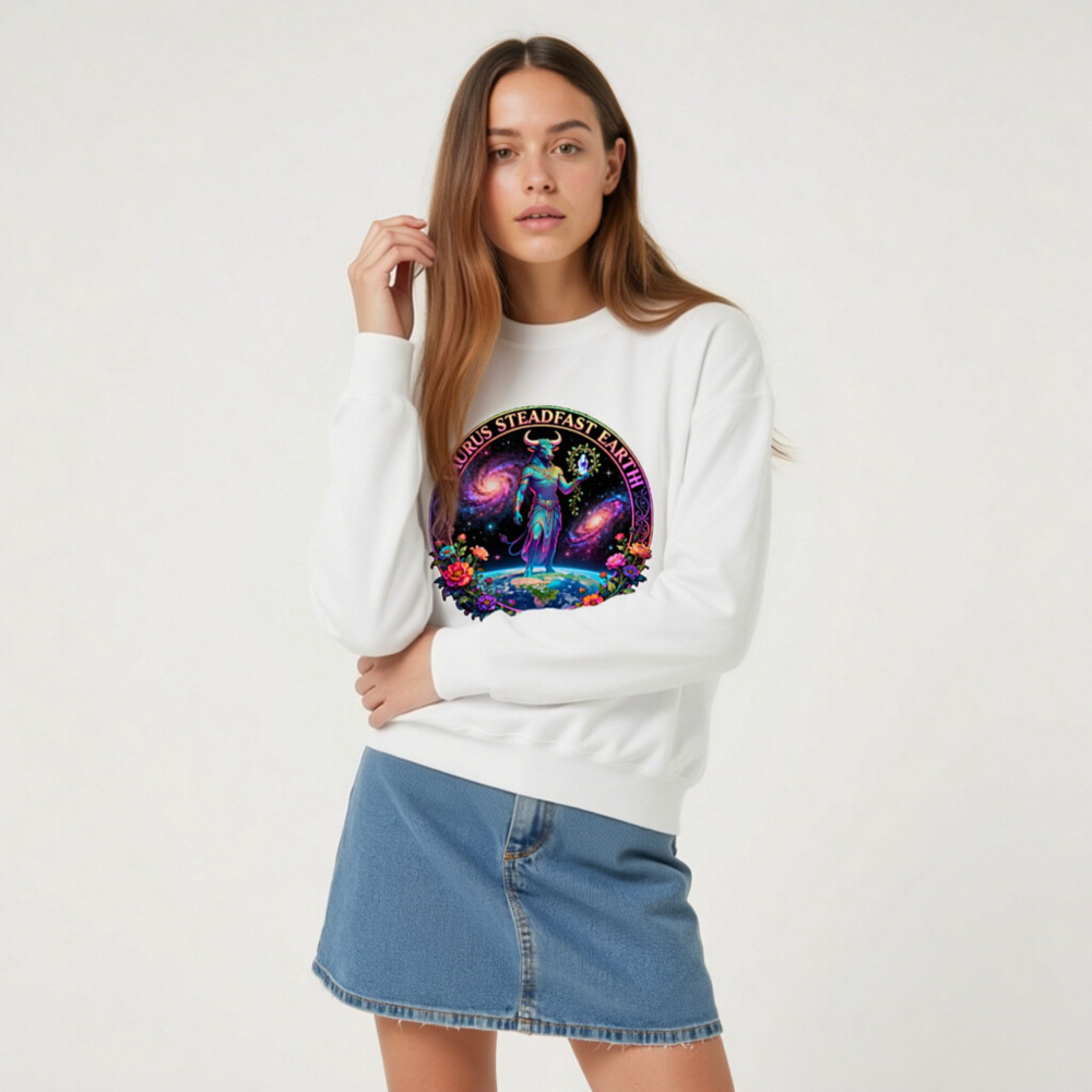 Taurus Steadfast Earth Unisex Crew Neck Sweatshirt – Cosmic Bull, Galaxy & Floral Design