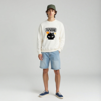 A playful unisex crew neck sweatshirt featuring a bold ‘TICKINNG TIME BOMB’ graphic with an angry black cat bomb and fiery spark. Soft, comfortable fit for everyday wear. Ideal for fans of quirky, pop-culture-inspired apparel. Made with quality cotton blend fabric.