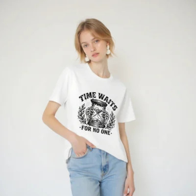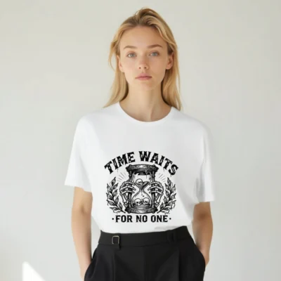 This unisex staple t-shirt features a striking black-and-white vintage-style graphic: skeletal hands holding an hourglass with skulls inside and below, flanked by laurel branches. The bold phrase ‘TIME WAITS FOR NO ONE’ is printed above and below the design. Made for everyday wear, this classic fit tee combines dark humor with timeless symbolism—ideal for fans of gothic, philosophical, or minimalist aesthetics.