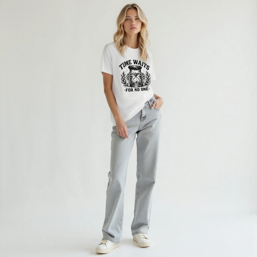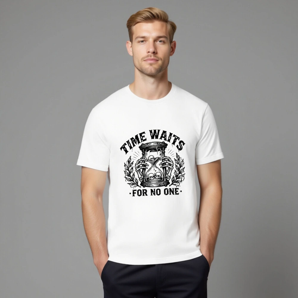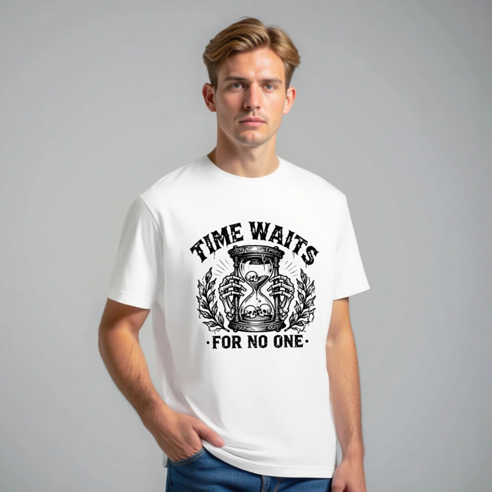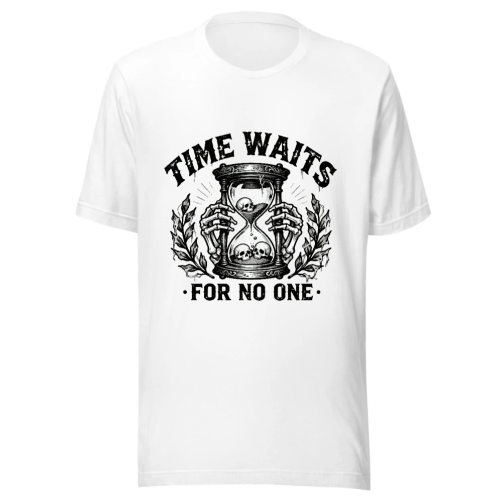 This unisex staple t-shirt features a striking black-and-white vintage-style graphic: skeletal hands holding an hourglass with skulls inside and below, flanked by laurel branches. The bold phrase ‘TIME WAITS FOR NO ONE’ is printed above and below the design. Made for everyday wear, this classic fit tee combines dark humor with timeless symbolism—ideal for fans of gothic, philosophical, or minimalist aesthetics.