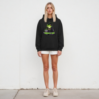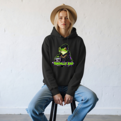 Wear the ‘Toadally Rad’ unisex eco hoodie — a vibrant green frog in a beanie and gold chain, holding a retro boombox. Made from sustainable materials, this essential hoodie blends streetwear style with eco-conscious design. Perfect for fans of quirky, bold fashion. Designed for comfort, fit, and conscious consumption.