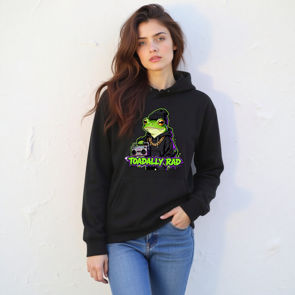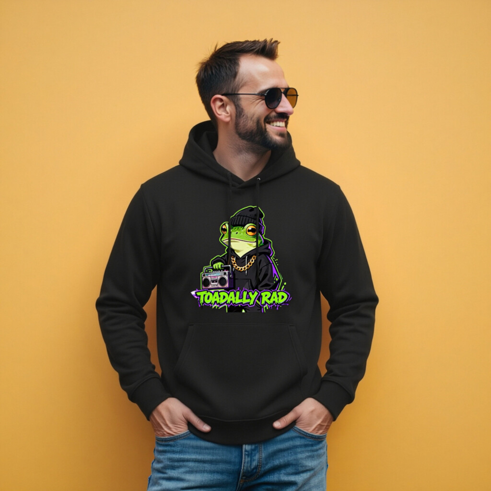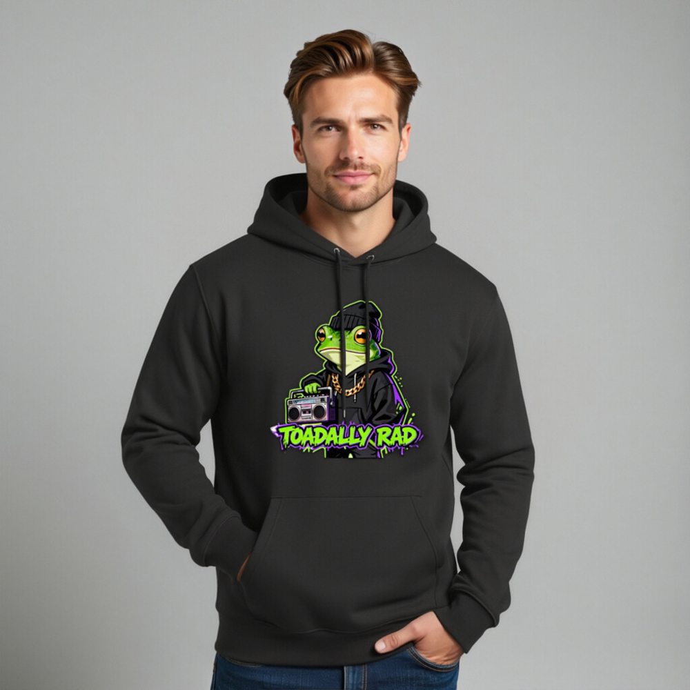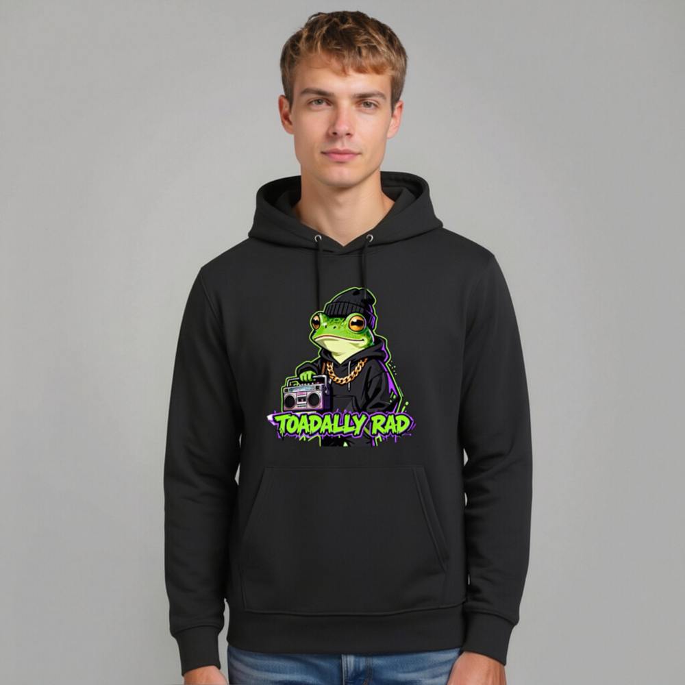 Wear the ‘Toadally Rad’ unisex eco hoodie — a vibrant green frog in a beanie and gold chain, holding a retro boombox. Made from sustainable materials, this essential hoodie blends streetwear style with eco-conscious design. Perfect for fans of quirky, bold fashion. Designed for comfort, fit, and conscious consumption.