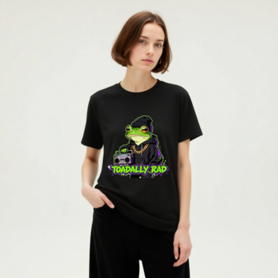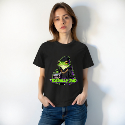 Show off your vibe with the ‘Toadally Rad’ unisex organic cotton t-shirt—featuring a cool green frog in a beanie, hoodie, and gold chain, holding a retro boombox. Made from certified organic cotton for comfort and sustainability. Perfect for casual wear, gifts, or expressing your unique style. Free shipping on orders over $50.