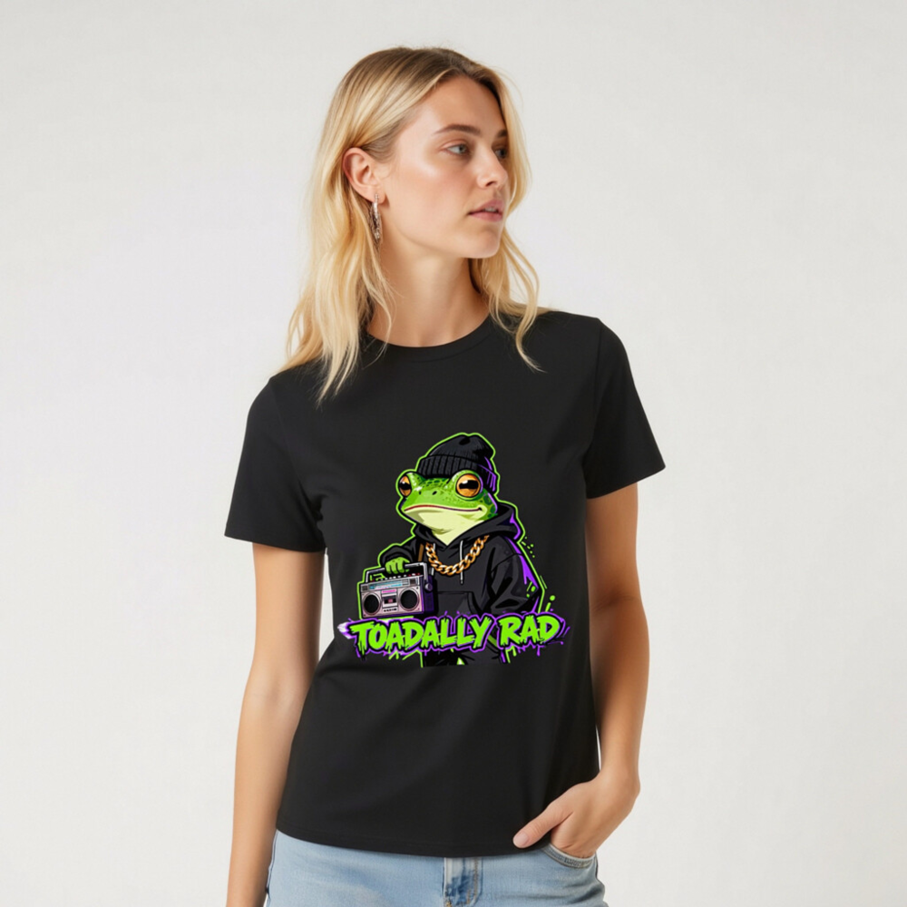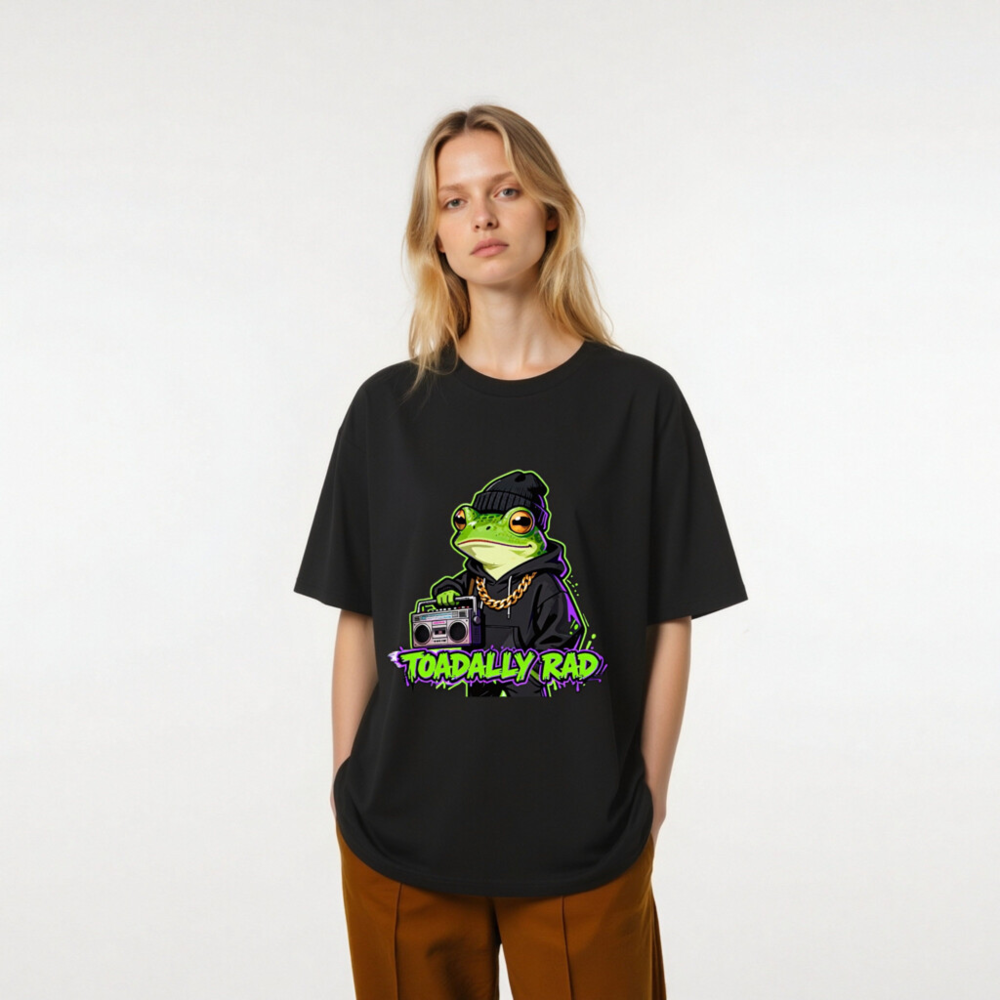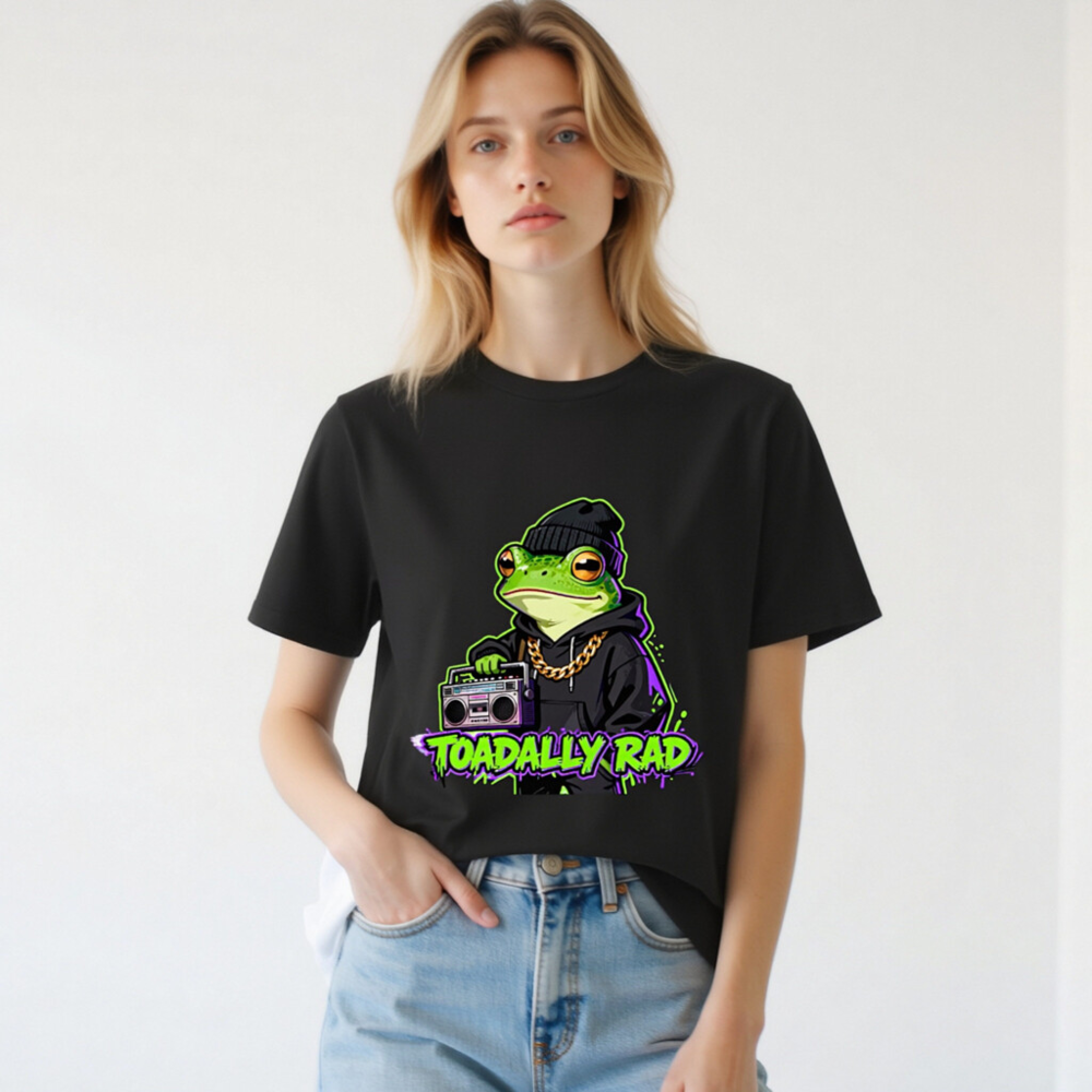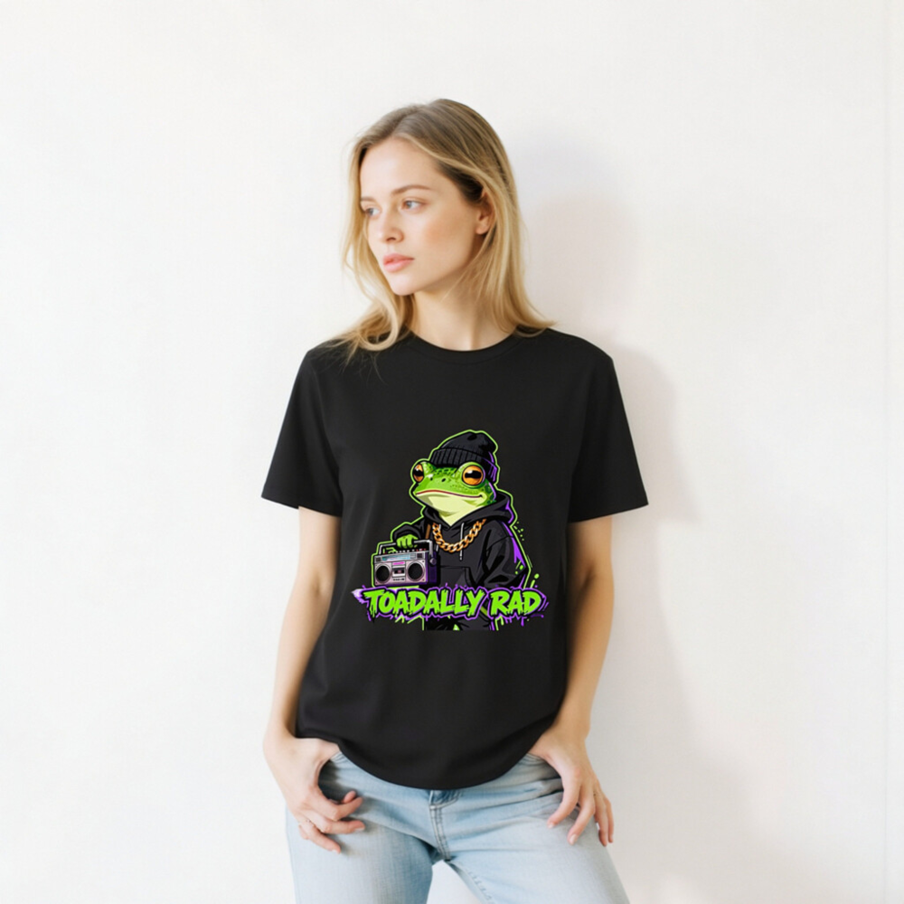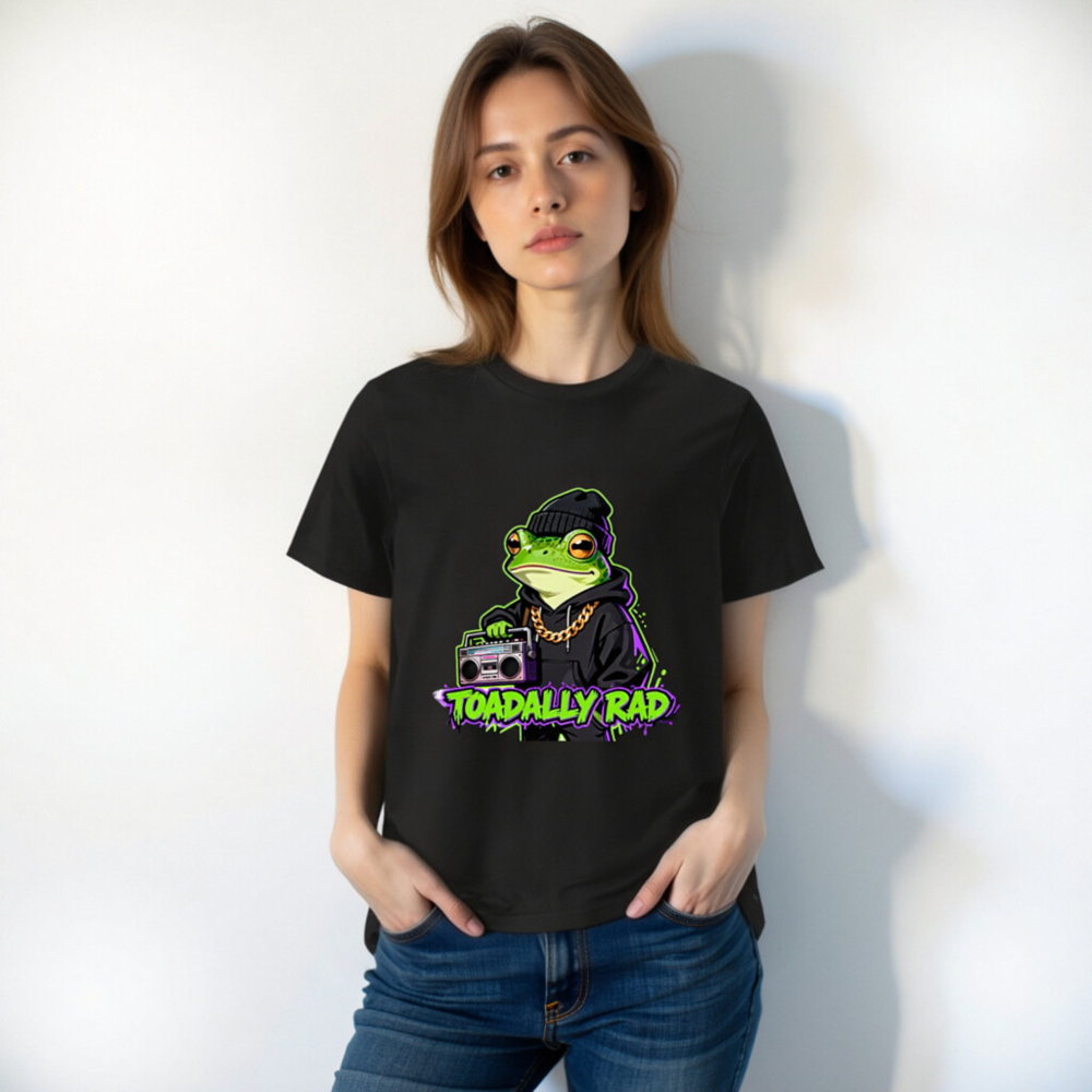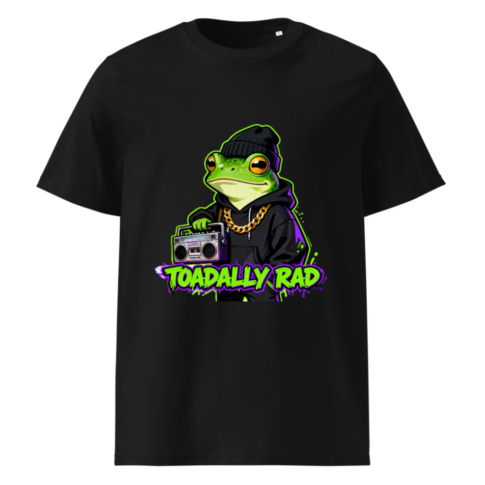 Show off your vibe with the ‘Toadally Rad’ unisex organic cotton t-shirt—featuring a cool green frog in a beanie, hoodie, and gold chain, holding a retro boombox. Made from certified organic cotton for comfort and sustainability. Perfect for casual wear, gifts, or expressing your unique style. Free shipping on orders over $50.