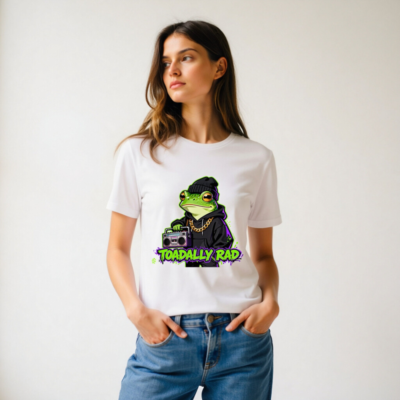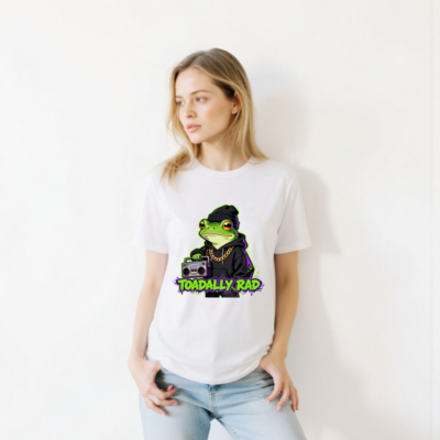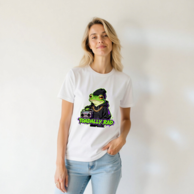 Show off your street cred with the ‘Toadally Rad’ unisex staple t-shirt. Featuring a vibrant green frog in a black hoodie, beanie, and gold chain, holding a retro boombox—perfect for fans of bold, playful streetwear. Soft cotton blend, classic fit, designed for everyday wear. Ideal for casual outings or as a fun gift. Get ready to turn heads with this eye-catching design.